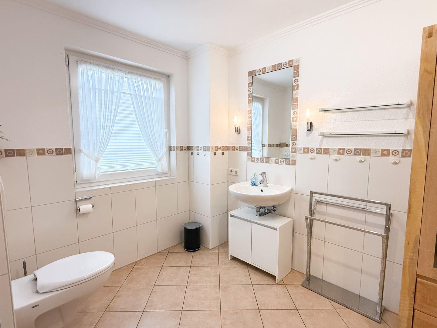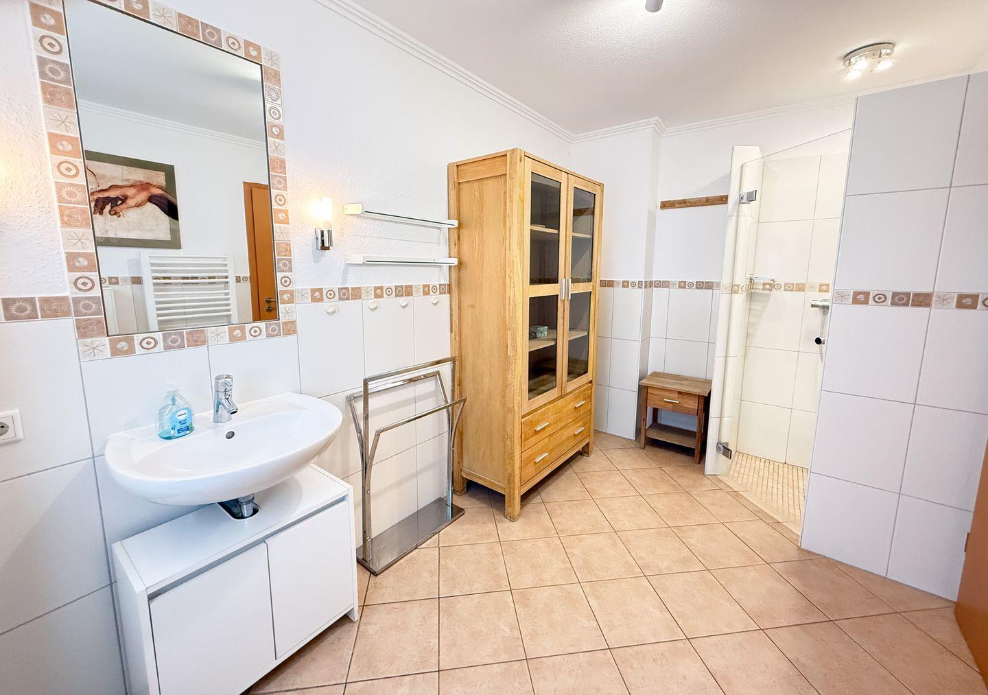 Das Badezimmer ist mit einer bodengleichen Dusche, Waschbecken, Spiegel, Fenster und einem Haartrockner ausgestattet. Für zusätzlichen Komfort finden Sie eine Waschmaschine und einen Trockner zur gemeinschaftlichen Nutzung im Haus – ideal für längere Aufenthalte oder Familienurlaub. Ein Ganzkörperspiegel, Staubsauger und Kommode ergänzen die Einrichtung.