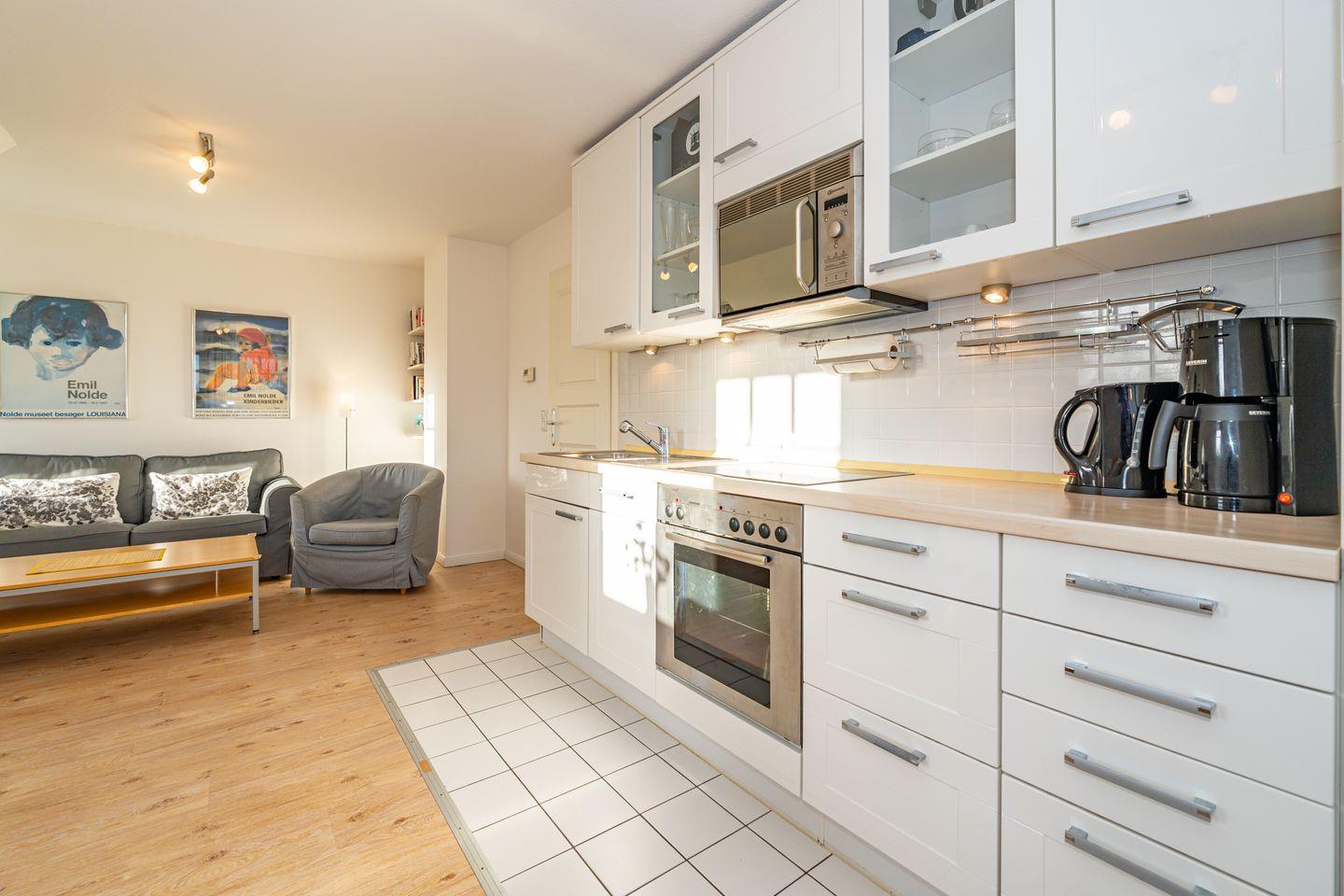 Der Wohnbereich ist als Wohnzimmer mit Sofa und Sessel gestaltet und bietet Ihnen einen TV. Die offene Küche ist direkt zum Wohnzimmer hin angelegt und ermöglicht entspanntes Zusammensein beim Kochen und Essen. Zur Ausstattung gehören Herd mit Ceran-Kochfeld, Kühlschrank mit Gefrierfach (Fach im Kühlschrank), Spülmaschine, Kaffeemaschine, Wasserkocher, Toaster sowie Küchenutensilien, Geschirr und Besteck. Ein Essbereich mit Esstisch ist ebenfalls vorhanden.