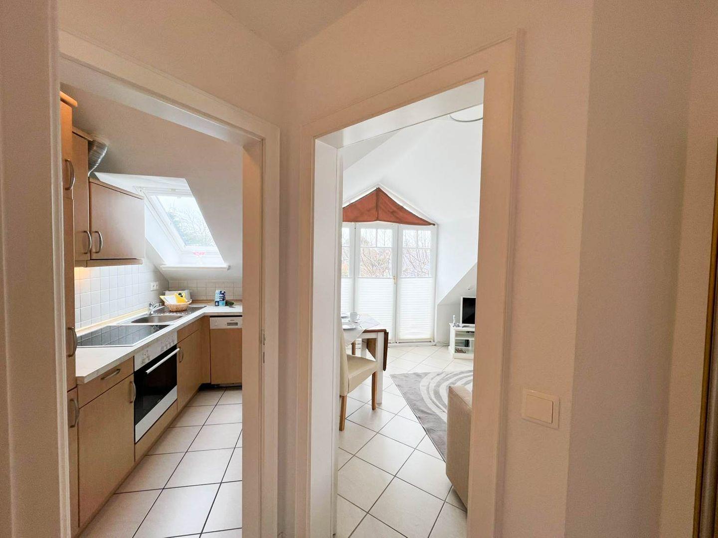 Schon beim Betreten spüren Sie die angenehme Atmosphäre: der offene Wohn- und Essbereich lädt mit einer komfortablen Sitz- und Sofaecke sowie einem einladenden Essplatz zum Verweilen ein. Große Fenster fluten den Raum mit Tageslicht und öffnen sich zum Balkon, auf dem Sie frische Seeluft und Sylter Sonnenstunden genießen können – ein herrlicher Ort für den ersten Kaffee des Tages oder einen entspannten Abend unter dem Himmel der Nordsee.