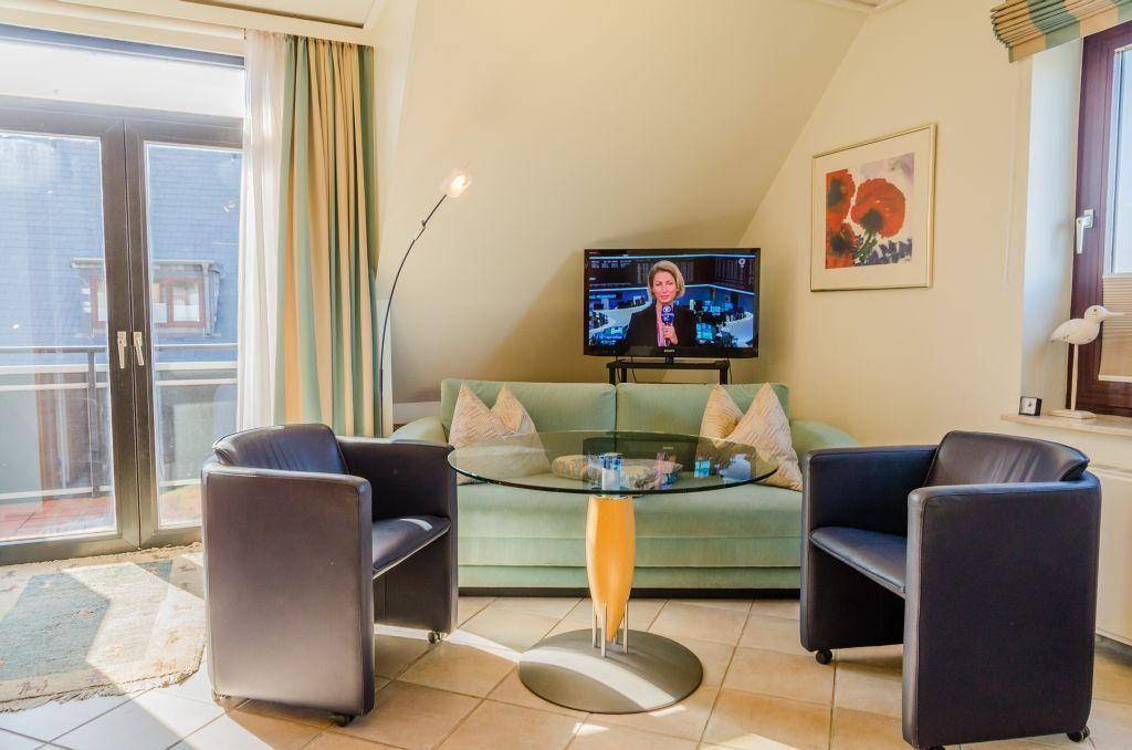 Das Wohnzimmer lädt mit einem gemütlichen Sofa, Sesseln und einem TV zu entspannten Stunden ein. Der direkte Zugang zum möblierten Süd-Balkon bietet die perfekte Möglichkeit, die Sonne zu genießen und das maritime Flair zu spüren.