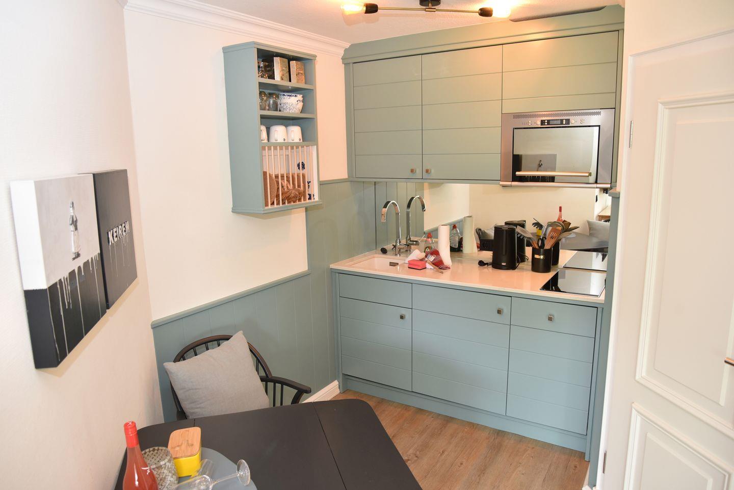 Treten Sie ein in den schönen und hellen Wohn-/Essbereich mit einer modernen Küchenzeile, wo Sie sich kulinarisch verwöhnen können. Genießen Sie entspannte Stunden in dieser gemütlichen Atmosphäre.