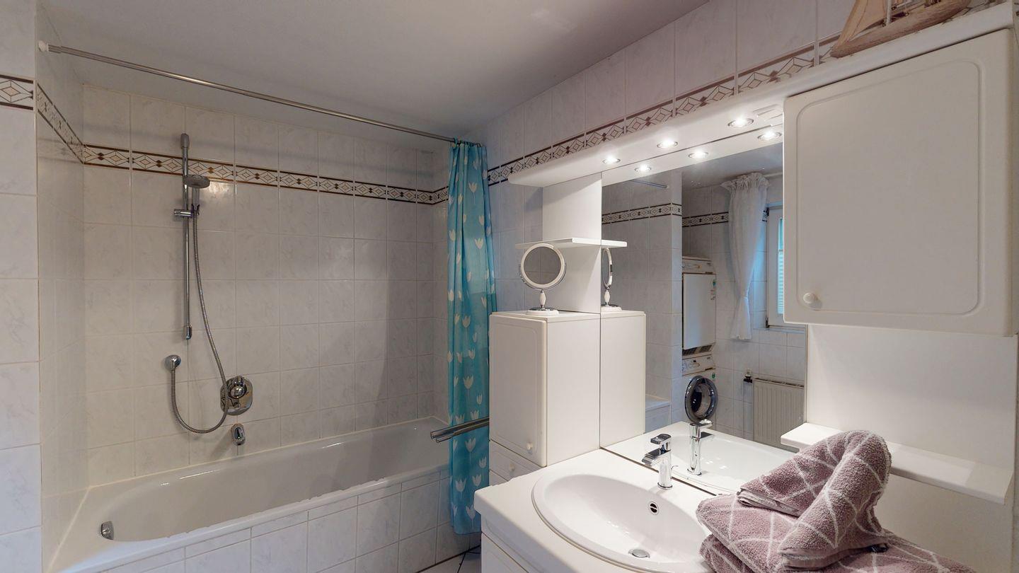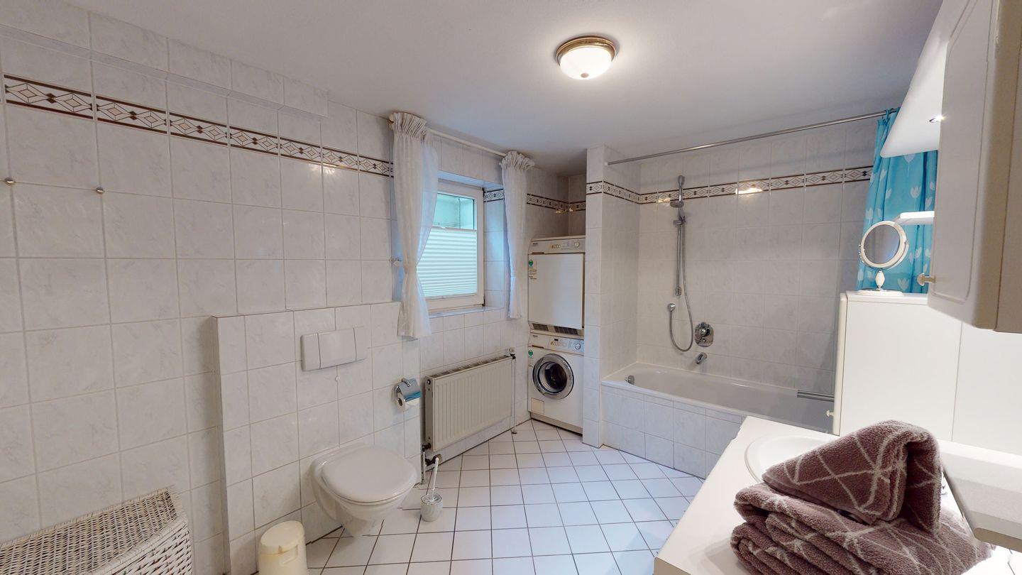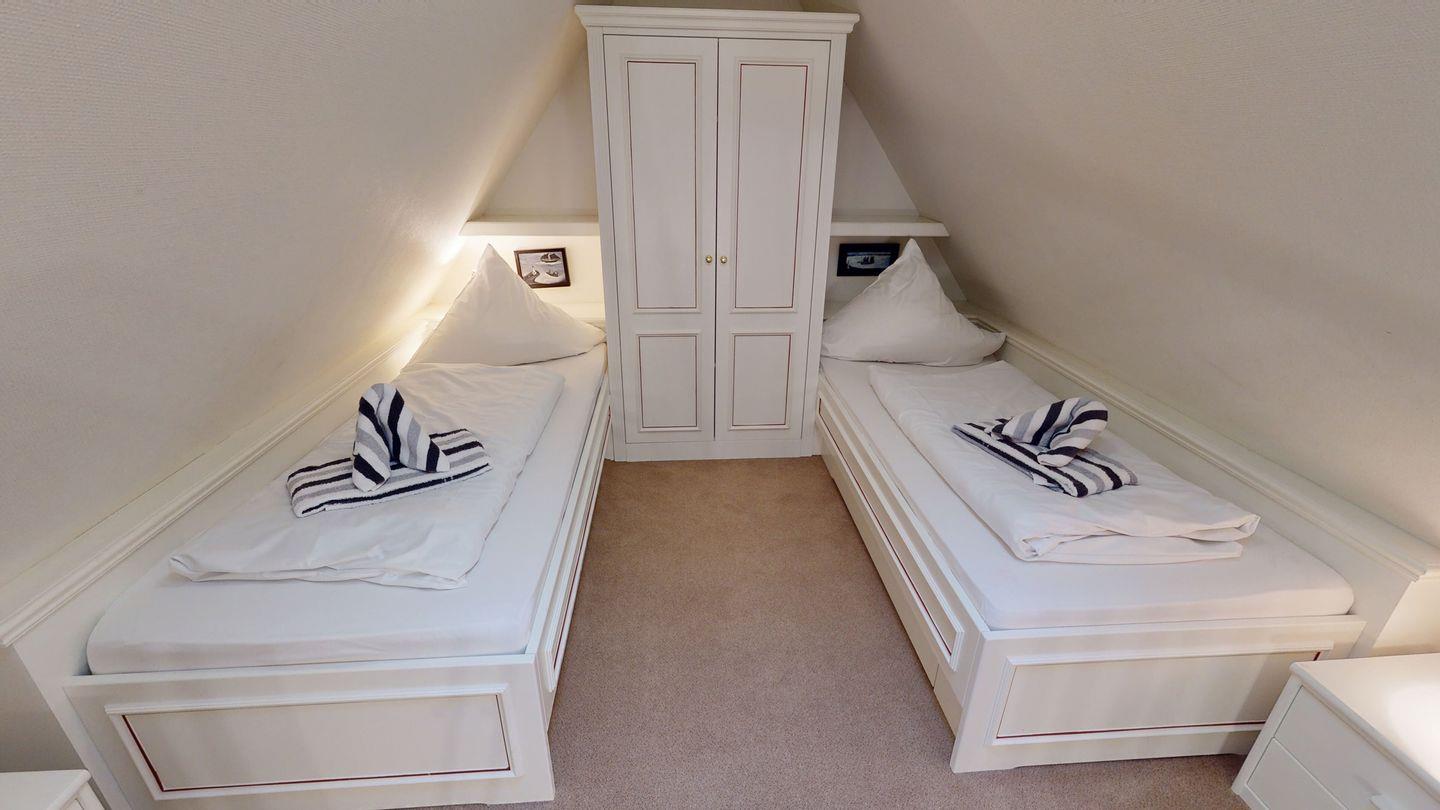 Der großzügige Wohnraum mit schwedischem Kamin schafft eine behagliche Atmosphäre. Geschmackvoll eingerichtete Schlafzimmer, darunter ein Schlafzimmer im Untergeschoss, zwei im Obergeschoss (eines mit 1,40 m Breite) und zwei Einzelbetten im Dachgeschoss, bieten höchsten Komfort. Das Hausteil verfügt über ein Duschbad, ein Wannenbad und ein Gäste-WC.