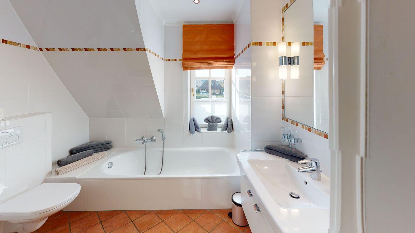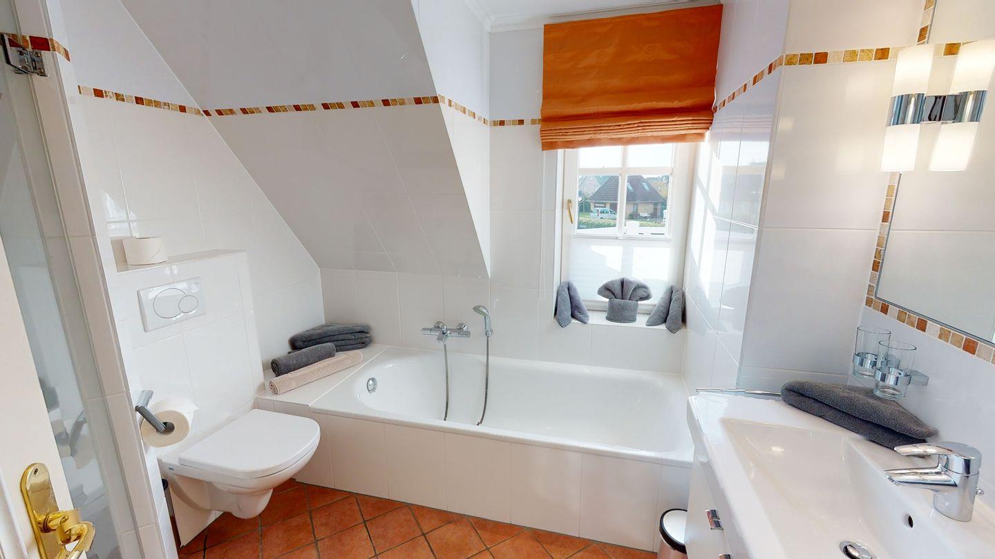 Im ersten Obergeschoss befindet sich ein modernes Badezimmer mit Dusche und Badewanne für Ihr Wohlbefinden. Zudem erwarten Sie hier zwei komfortable Doppelschlafzimmer, eines davon mit einem eigenen Balkon, auf dem Sie die frische Nordseeluft genießen können.