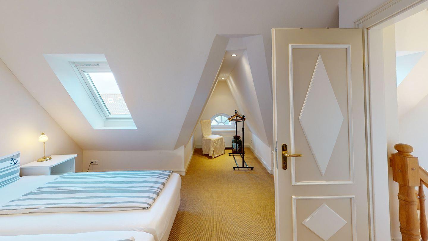 Das Dachgeschoss bietet einen weiteren Rückzugsort mit einem zusätzlichen Doppelschlafzimmer und einem angrenzenden Wannenbad, das zum Entspannen einlädt.