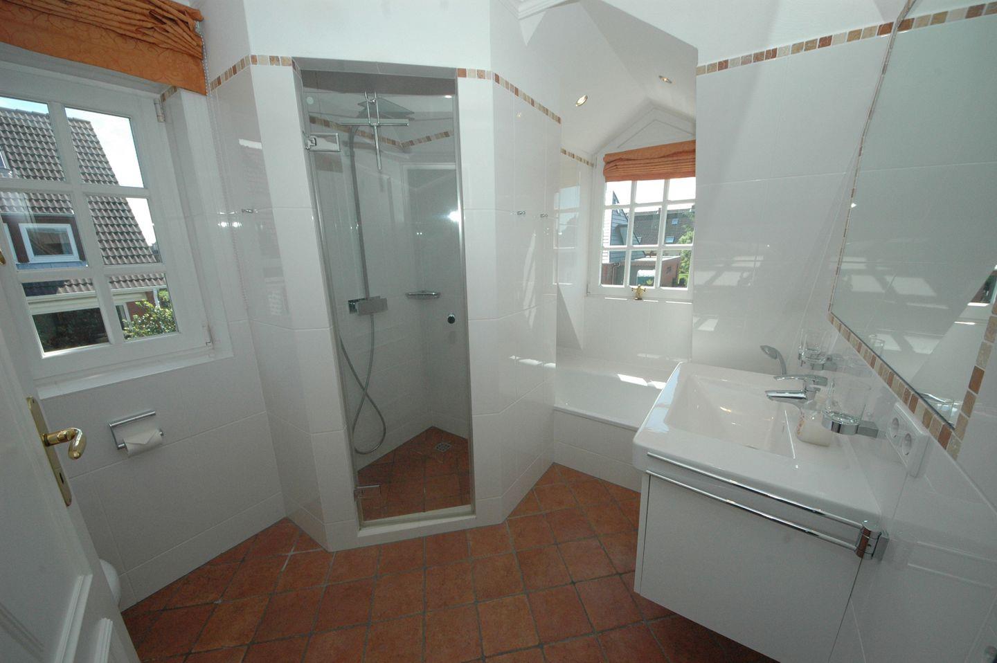 Im ersten Obergeschoss befindet sich ein modernes Badezimmer mit Dusche und Badewanne für Ihr Wohlbefinden. Zudem erwarten Sie hier zwei komfortable Doppelschlafzimmer, eines davon mit einem eigenen Balkon, auf dem Sie die frische Nordseeluft genießen können.