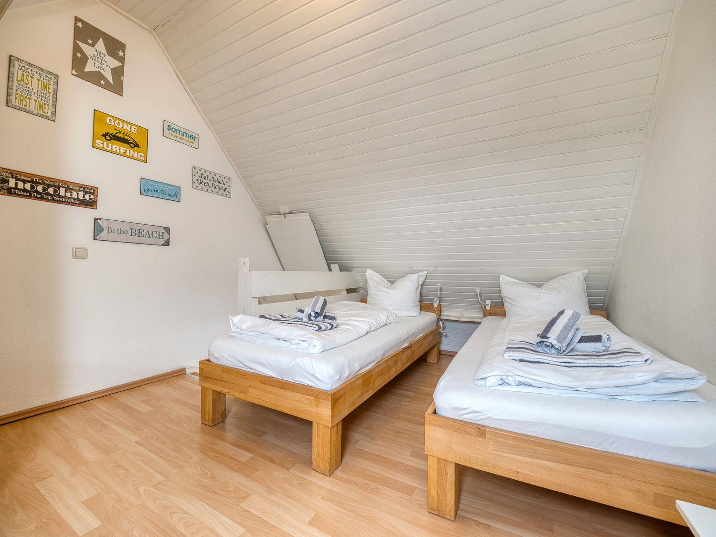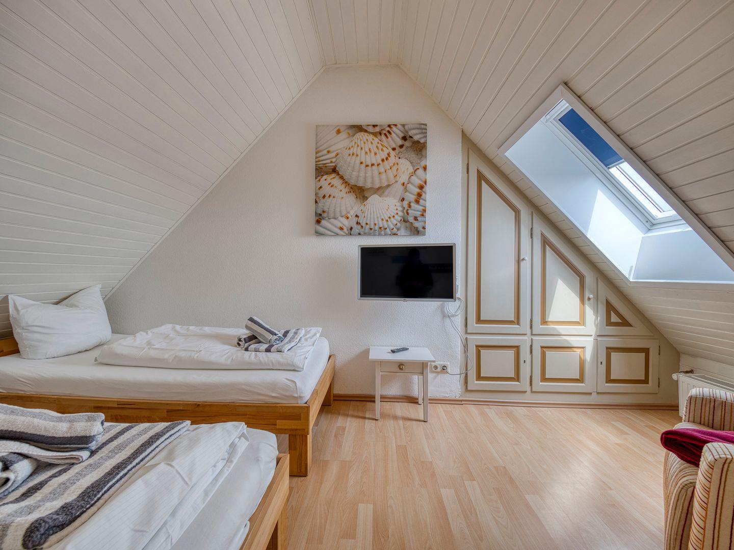Das Appartement verfügt zudem über einen Schlafraum mit zwei Einzelbetten und ein modernes Duschbad. Vom Balkon aus nach Südwesten genießen Sie die Sonne und eine herrliche Aussicht. Im Dachgeschoss erwartet Sie der gemütliche Master-Bedroom mit ebenfalls zwei Einzelbetten.