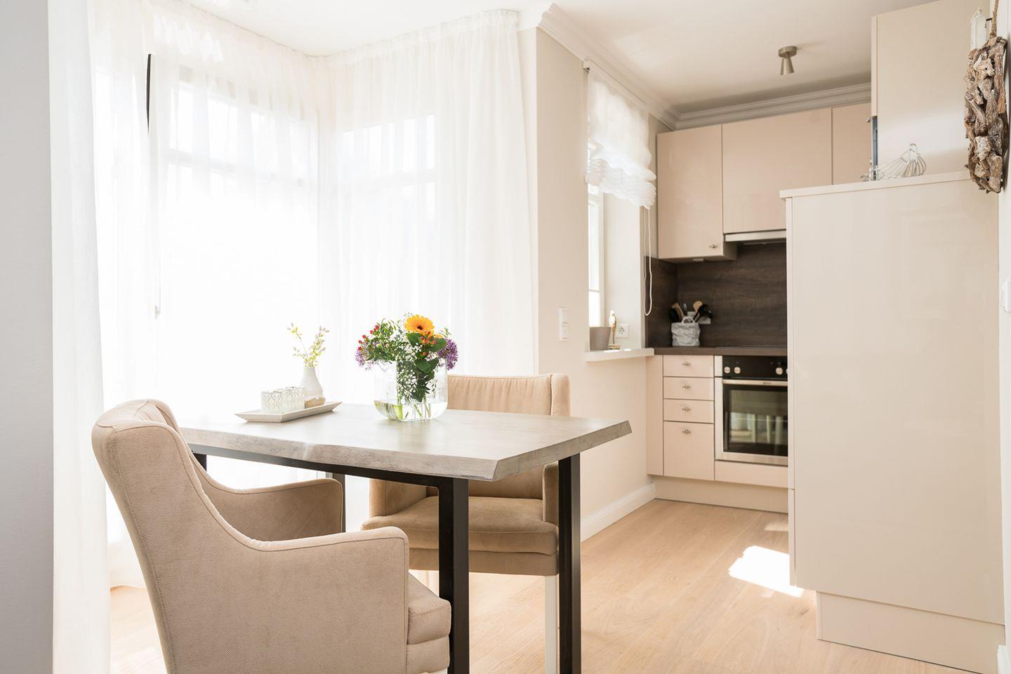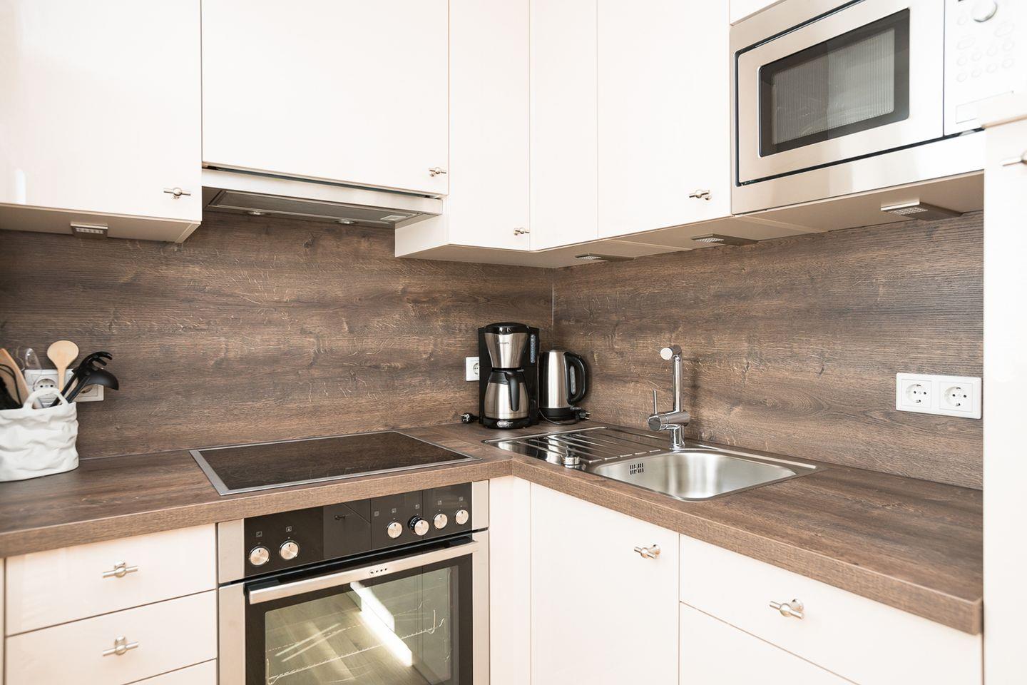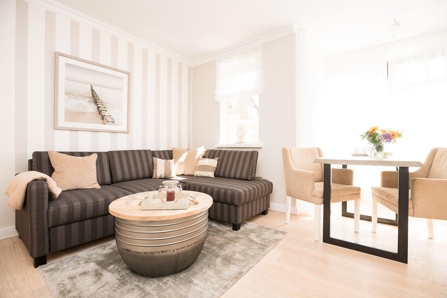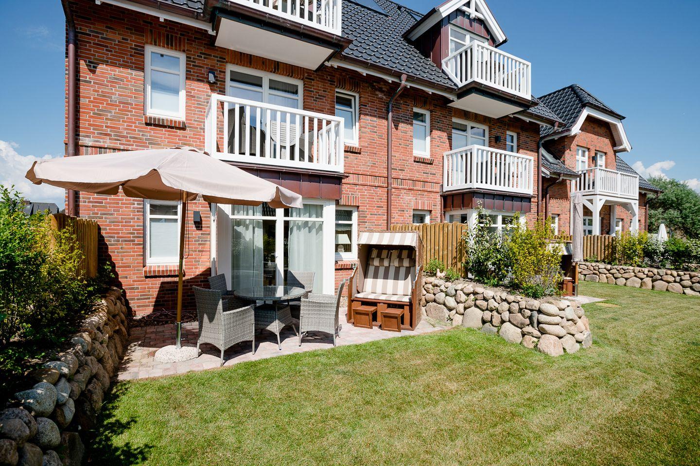 Auf der sonnigen Süd/Westterrasse können Sie die frische Luft genießen und die passenden Gartenmöbel sowie ein Strandkorb stehen Ihnen zur Verfügung. Die elegante Küche wurde mit viel Liebe zum Detail gestaltet und passt perfekt zum Gesamtkonzept. Der Wohnraum ist geschmackvoll in Erdtönen eingerichtet und die Badezimmer sind mit hochwertigem Design ausgestattet.