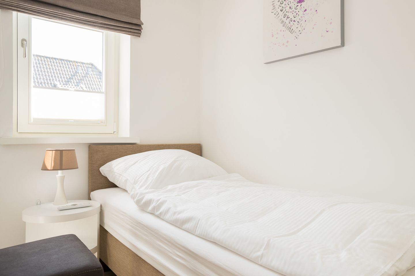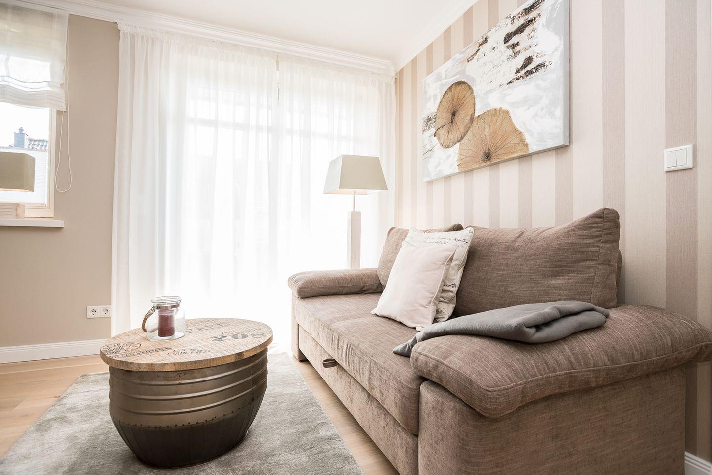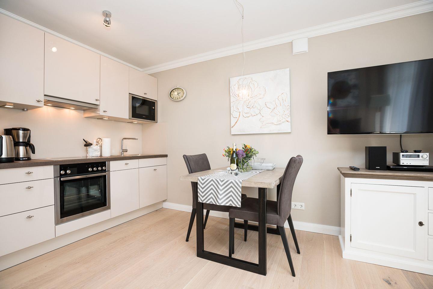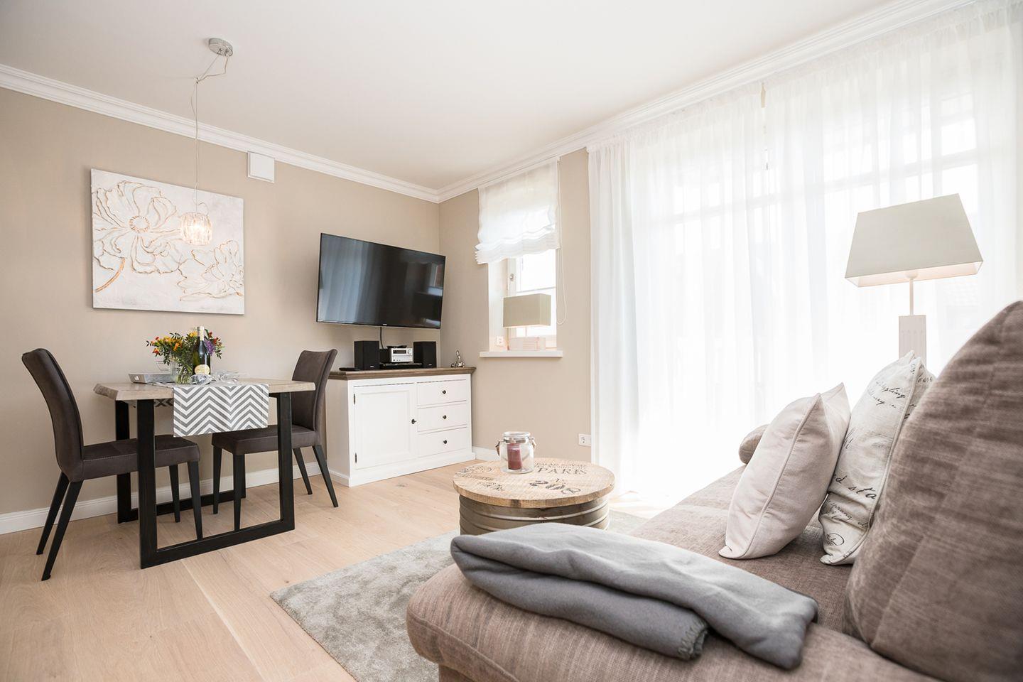 Die extravagante Obergeschoss-Wohnung bietet Platz für 3 Personen auf großzügigen 45 qm. Sie verfügt über einen Doppelschlafraum, einen Einzelschlafraum sowie ein modernes Duschbad – alles auf einer Ebene. Der Südbalkon lädt mit hochwertigen Gartenmöbeln zum Verweilen ein. Die elegante Küche fügt sich vorzüglich in den Gesamtstil ein und ist komplett ausgestattet. Erdtöne prägen das Ambiente des Wohnraums, während die Bäder mit zeitgemäßem Design punkten.