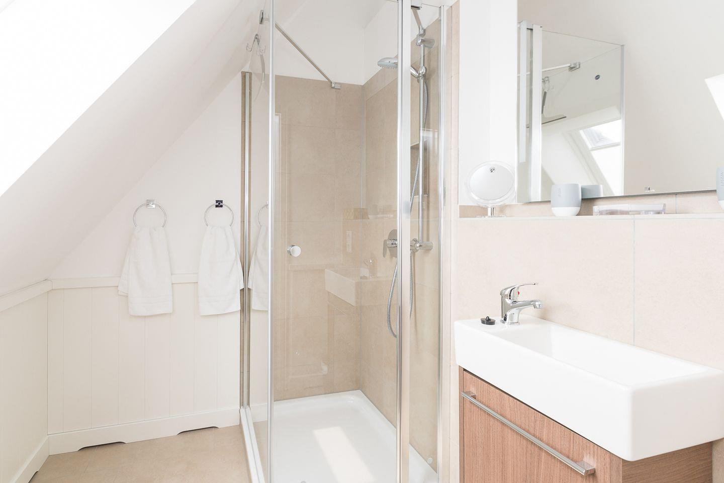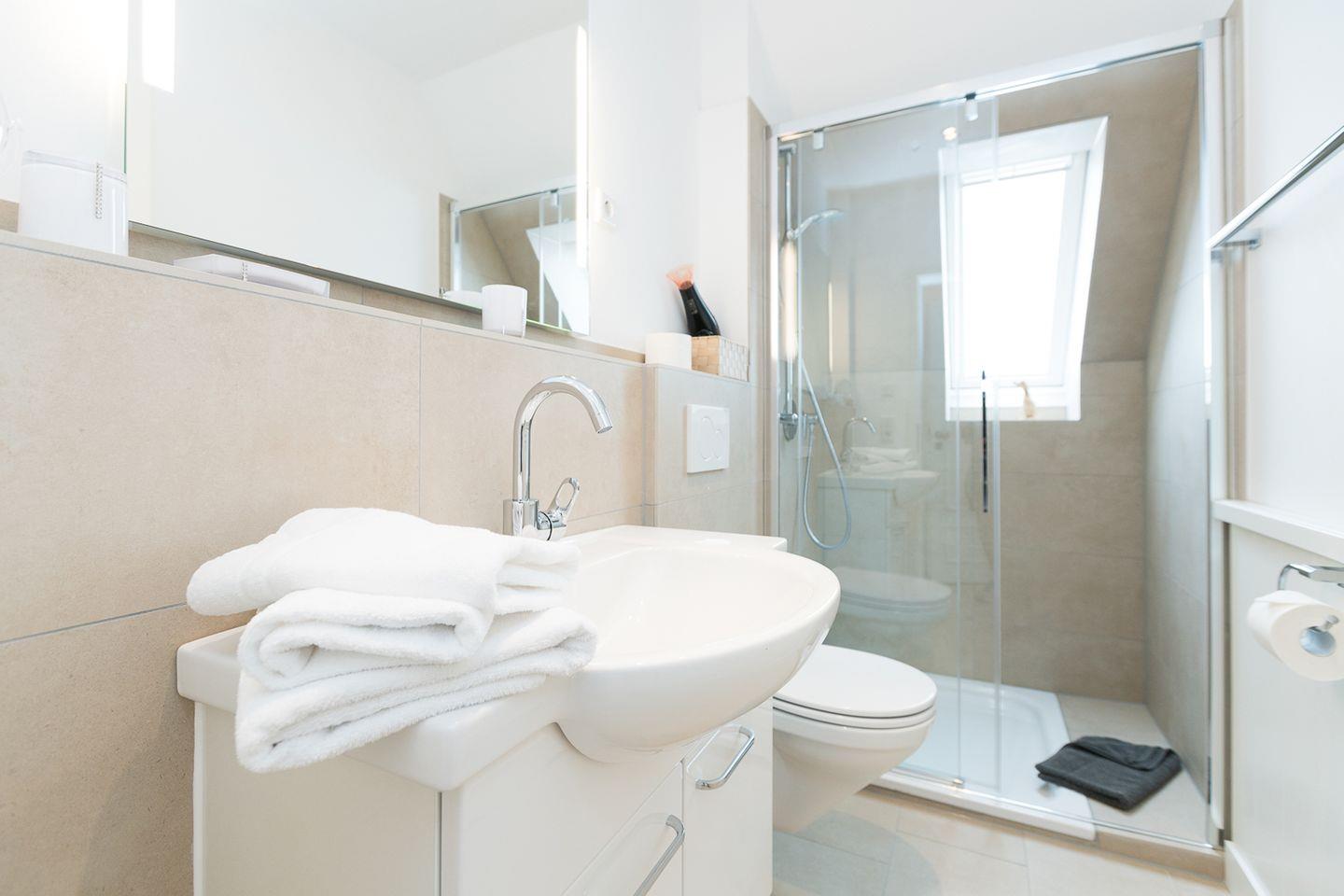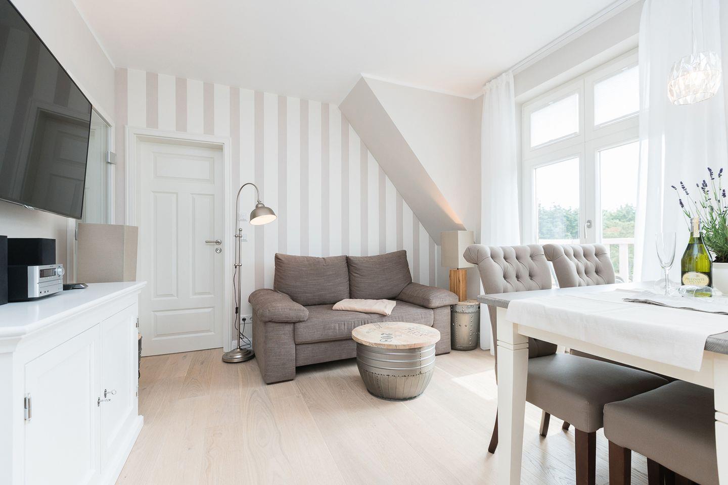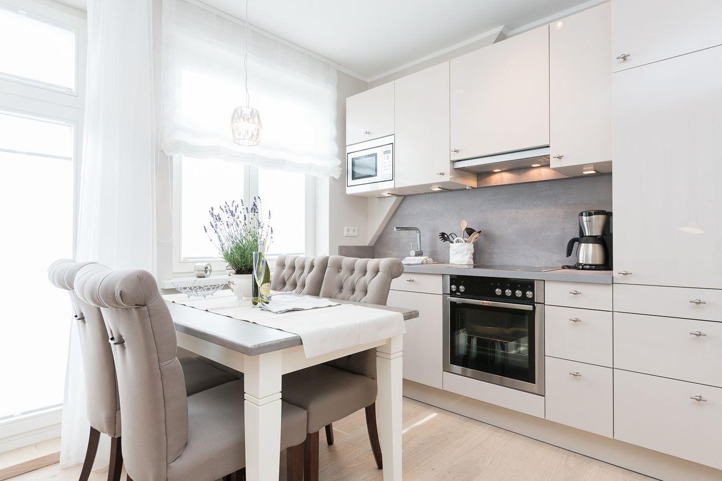 Die exquisit eingerichtete Maisonette-Wohnung im Obergeschoss und Dachgeschoss mit Südbalkon bietet großzügigen Raum für 4 Personen auf circa 60 qm. Auf jeder Etage befindet sich ein komfortabler Doppelschlafraum, ergänzt durch ein Duschbad/WC im Dachgeschoss sowie ein zusätzliches Dusch/WC im Obergeschoss. Die elegante Küche passt sich perfekt dem Gesamtstil an und ist mit modernsten Annehmlichkeiten ausgestattet.