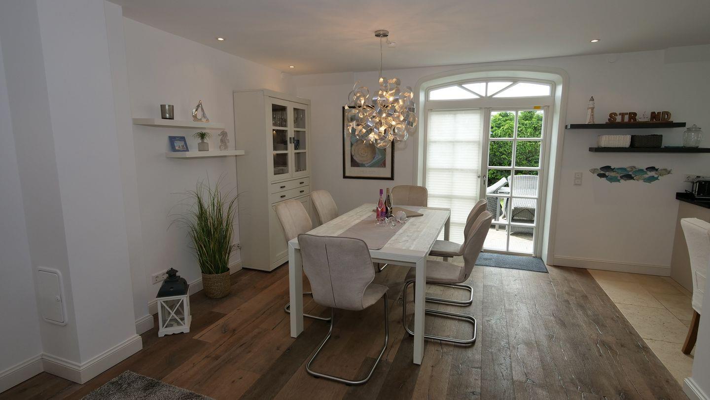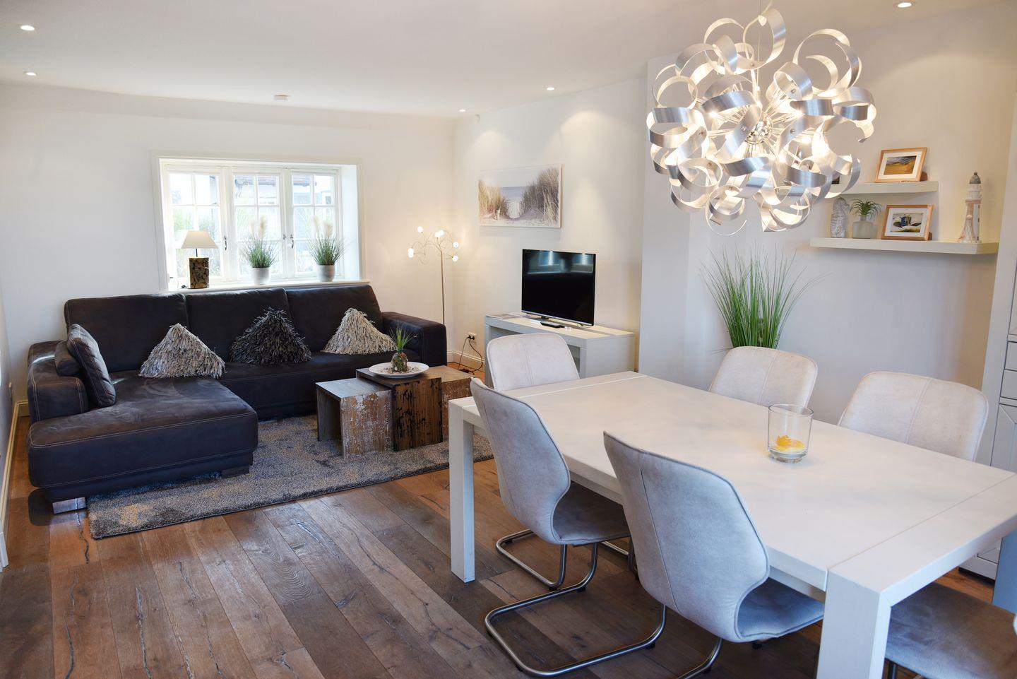 Willkommen in diesem luxuriösen Reetdach-Hausteil mit großzügigen 113 qm Wohnfläche, das Platz für bis zu 8 Personen bietet. Es erwarten Sie ein geräumiger Wohn- und Essbereich mit offener Küche sowie ein Gäste-WC. Eine sonnige Süd-Westterrasse mit stilvollen Gartenmöbeln und ein gemütlicher Strandkorb auf der Südostseite stehen Ihnen ebenfalls zur Verfügung.