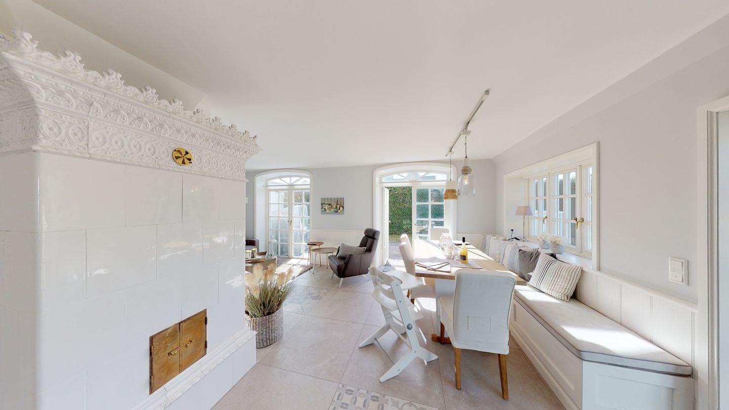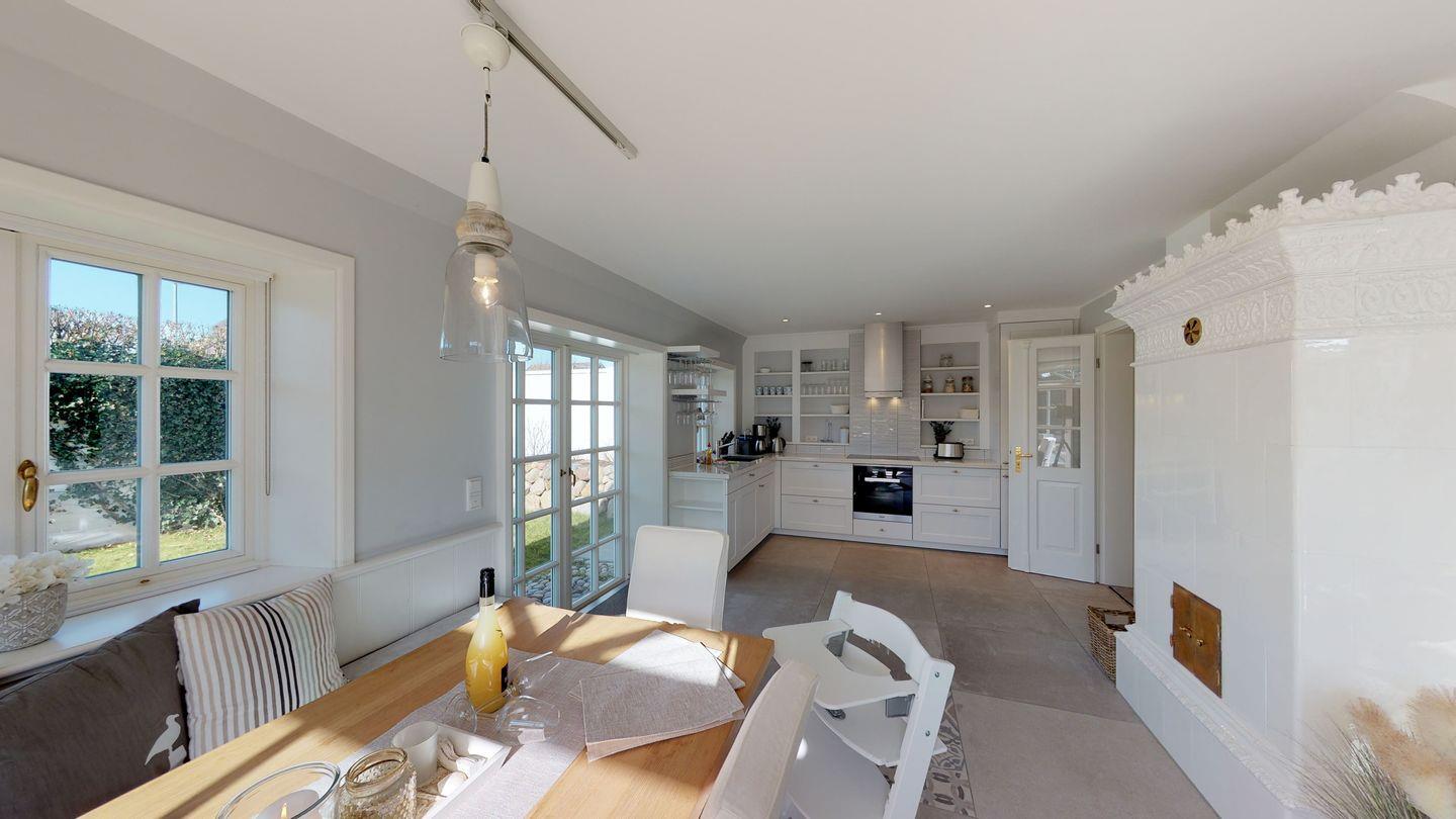 Willkommen in diesem luxuriösen Reetdachhaus, das zu einem unvergesslichen Urlaub einlädt. Im Erdgeschoss erwartet Sie eine gemütliche Sitzgarnitur, ein großzügiger Esstisch mit Sitzbank und Stühlen für gesellige Runden von bis zu 5 Personen sowie ein antiker Kachelofen für wohlige Wärme in der kalten Jahreszeit. Die vollausgestattete SieMatic-Einbauküche im Küchenbereich bietet alle technischen Annehmlichkeiten. Ein Gäste-WC befindet sich ebenfalls im Erdgeschoss.