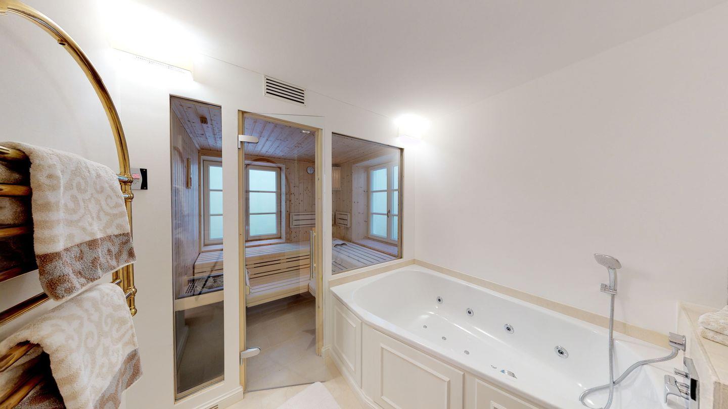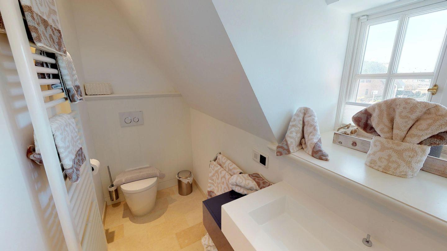 Duschbad. Im Untergeschoss finden Sie einen weiteren Schlafraum mit Doppelbett und ein Bad mit Dusche und WC. Hier steht Ihnen auch eine Sauna und eine großzügige Whirlpool-Wanne für die Erholung nach einem Strandbesuch oder an kalten Tagen zur Verfügung. Die Waschmaschine mit integriertem Trockner ist im Untergeschoss untergebracht.