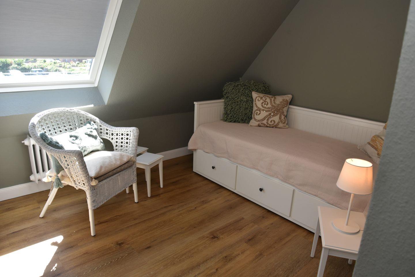 Ein besonderes Highlight sind die großen Fensterfronten im lichtdurchfluteten Wohnbereich, die nach Süden und Westen ausgerichtet sind. Der schöne Garten des Eckhausteils und die moderne südamerikanische Einrichtung verleihen dem Ambiente eine besondere Note. Im Erdgeschoss befinden sich eine separate Küche und ein Gäste-WC. Das Obergeschoss verfügt über einen Doppelschlafraum und ein Kinderzimmer mit Ausziehbett für 2 Kinder oder einen Einzelschlafplatz für 1 Erwachsenen, sowie ein Duschbad/WC. Zusätzlich gibt es einen Masterbedroom mit Doppelbett. Das Dachgeschoss beherbergt ein weiteres großes Schlafzimmer mit 2 Einzelbetten.