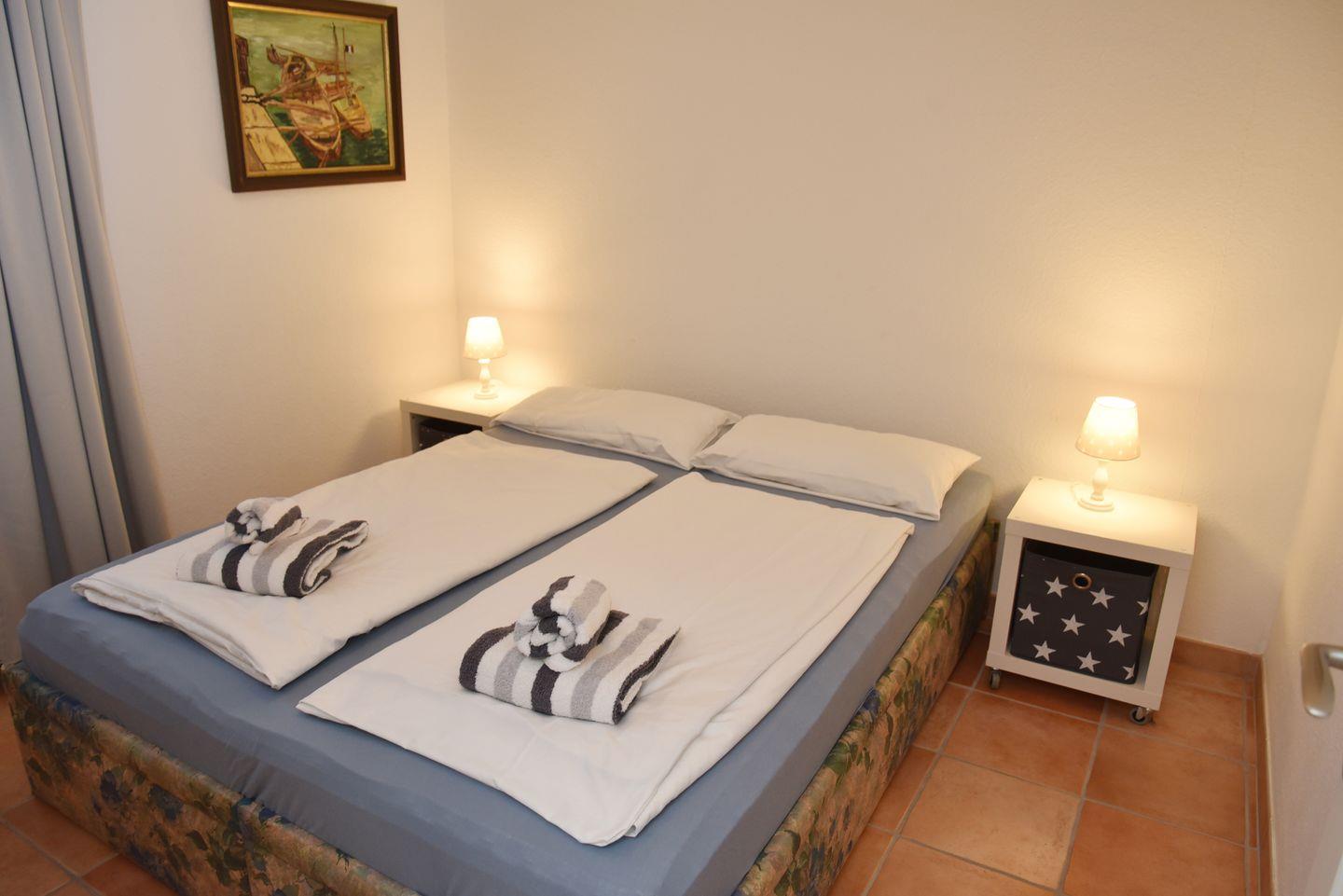 Das Schlafzimmer ist mit einem gemütlichen Doppelbett ausgestattet und bietet Ihnen eine erholsame Nachtruhe. Ein helles Duschbad sorgt für Ihren Komfort während Ihres Aufenthalts.
