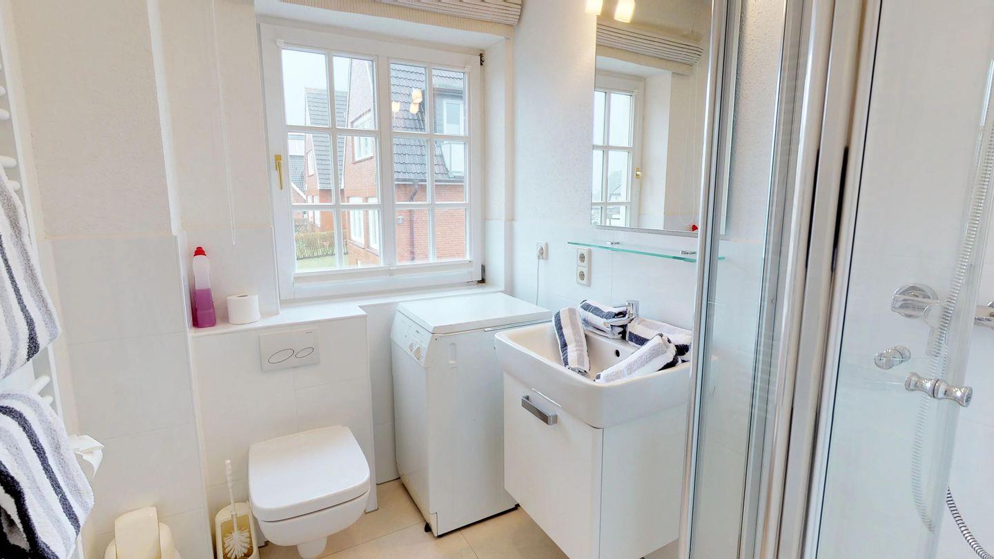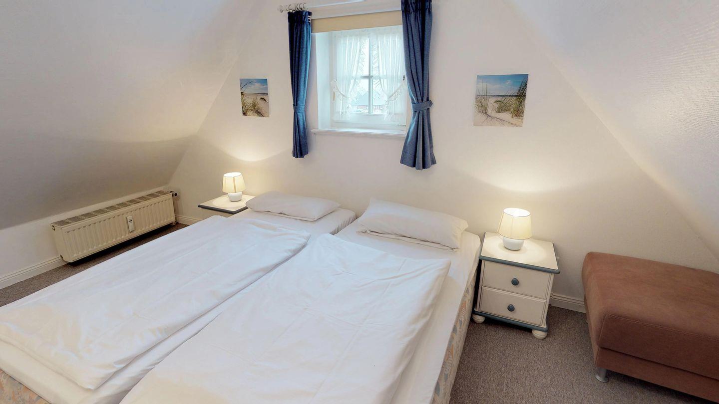 Ein geräumiger Doppelschlafraum im Obergeschoss bietet Platz für erholsame Nächte, während sich im Dachgeschoss ein weiterer gemütlicher Doppelschlafraum befindet. Außerdem gehört zu dieser Wohnung ein Sonnenplatz mit einem Strandkorb, der geschützt hinter dem Haus liegt und sich perfekt für entspannte Stunden im Freien eignet.
