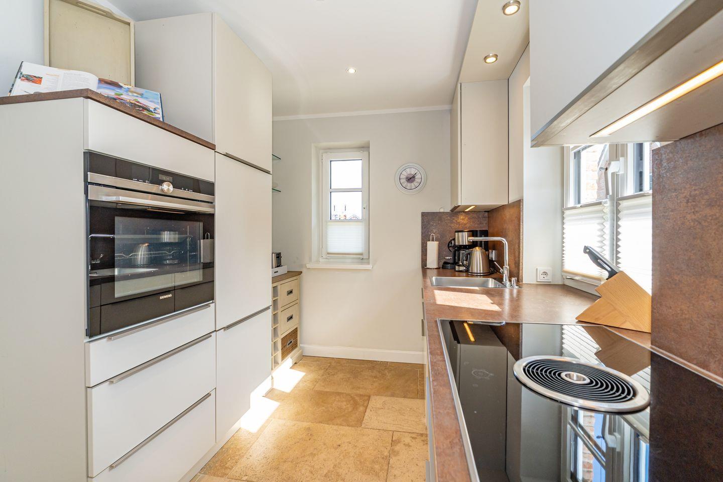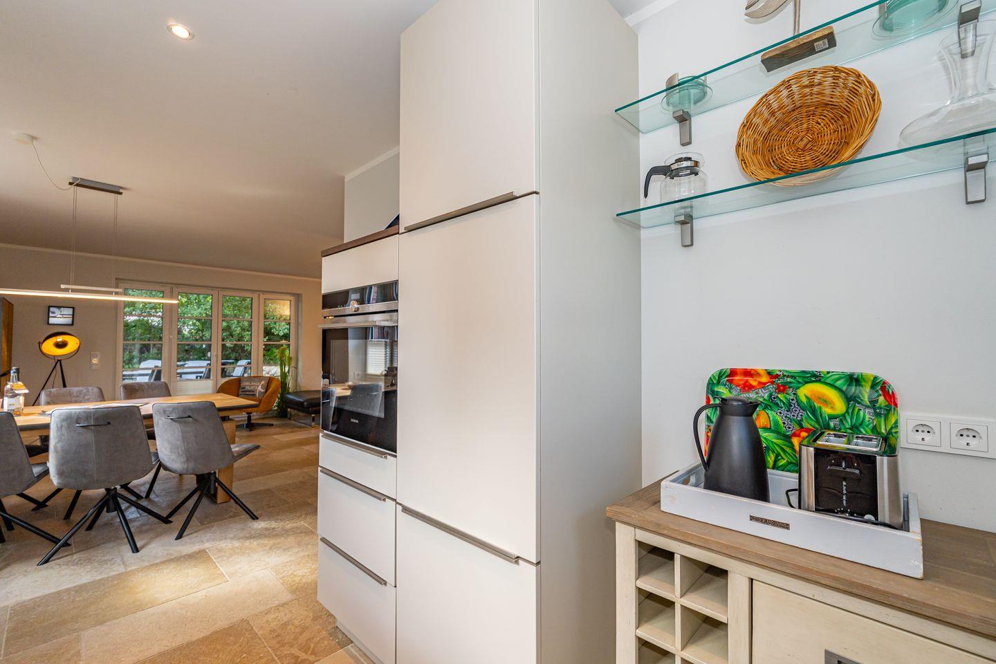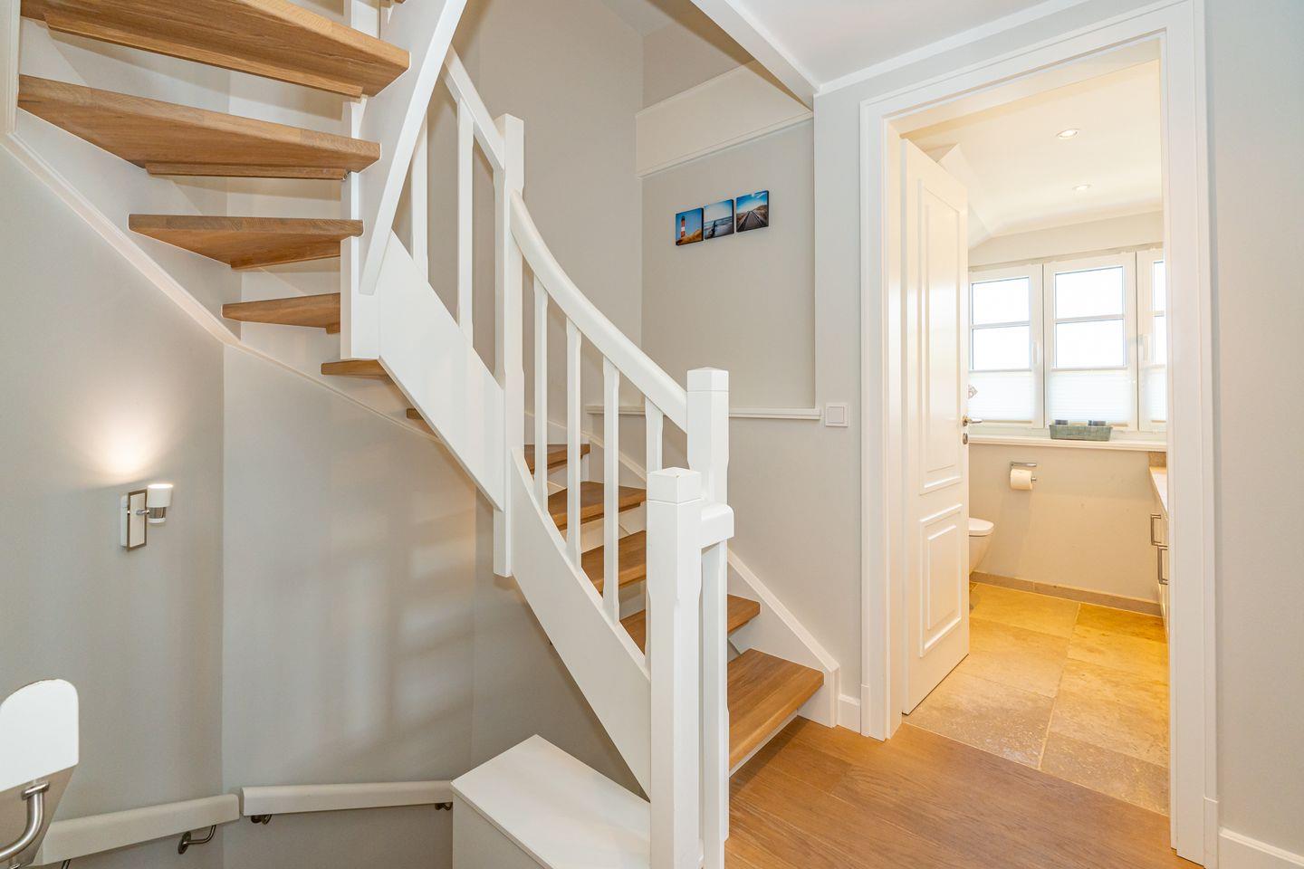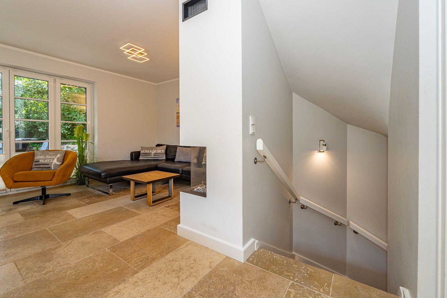 Im Erdgeschoss erwartet Sie ein Flur mit Garderobe. Von hier geht ein Gäste WC ab. Ebenfalls das geräumige und helle Wohn- und Esszimmer. Hier wartet Sie ein kuscheliger Gas Kamin, Sofa, TV und Essplatz. Angrenzend an diesen Bereich ist die offene Küche, hier können Sie köstliche Mahlzeiten zubereiten. Sie ist ausgestattet mit eine, Backofen, Induktionsherd mit Bora Feld, Geschirrspülmaschine, Gefrierschrank und Kaffeefiltermaschine. Vom Wohn- und Essbereich haben Sie Zutritt zum Garten mit Terrasse, Gartenmöbeln und Strandkorb. Über eine Treppe gelangen Sie in das erste OG, hier befindet sich ein Schlafzimmer mit Doppelbett (180x200), ein Badezimmer mit Dusche und Doppelwaschbecken. Als Highlight erwartet Sie auf dieser Ebene ein Kinoraum mit extra großem Smart-TV und gemütlichen Kinosesseln. Über eine weitere Treppe gelangen Sie in den Spitzboden, wo sich ein Schlafzimmer mit zwei Einzelbetten (je 90x200) und ein Gäste WC befinden. Im Souterrain des Hauses ist ein weiteres Schlafzimmer mit Doppelbett (180x200) und ein Badezimmer mit Dusche und Sauna. Zum Ferienhaus gehört ein PKW Stellplatz.