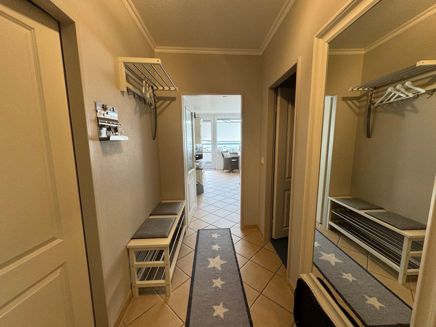 Die sehr gute Ausstattung dieses neuwertigen Appartements bietet Ihnen, neben moderner Möbelierung der Sylter-Wohnwelt und der gehobenen Grundausstattung, ein wirklich angenehmes Wohlfühlklima, mit allem was man für einen erholsamen Urlaub braucht. Der große Eingangsbereich des Appartements bietet Ihnen viel Ablagefläche und einen extra Abstellraum.