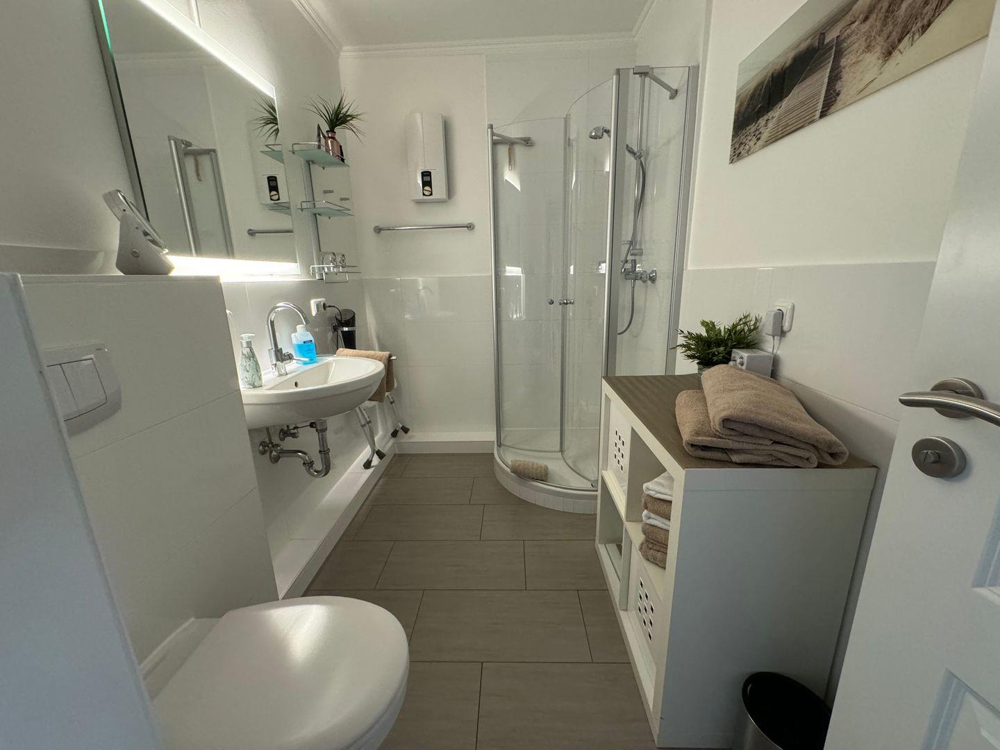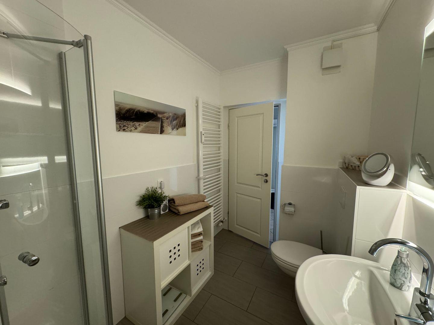 Das moderne Duschbad/WC ist sehr großzügig ausgestattet mit viel Ablageflächen. Ein Kosmetikspiegel sowie Duschhocker, Personenwaage, Fön und ein Radio sind selbstverständlich vorhanden.