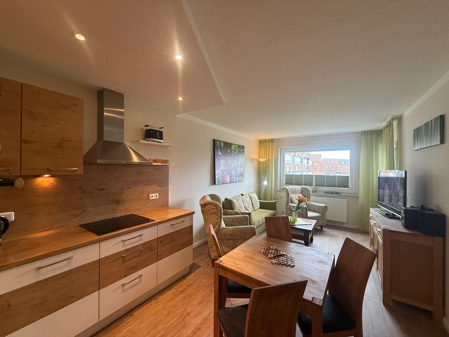 Auf "(ca. 40 m²) erwarten dich ein Schlafzimmer, ein Wohnzimmer für bis zu 4 Gäste, eine voll ausgestattete Küche, zwei TVs und ein Balkon. Der feine Sandstrand ist nur 700 m entfernt perfekt für Paare oder Familien.