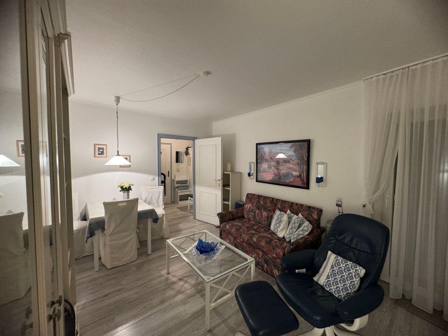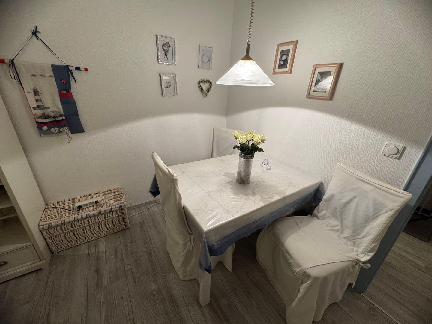 Die Ferienwohnung befindet sich im Hochparterre eines gepflegten Hauses und besticht durch ihre gemütliche und einladende Atmosphäre. Der Wohnbereich ist im modernen Laminatstil gehalten und bietet ein bequemes Sofa sowie einen Esstisch, an dem Sie gemeinsame Mahlzeiten genießen können. Für Ihre Unterhaltung sorgt ein Fernseher mit kabelgebundenem Anschluss sowie WLAN, das Ihnen kostenlos zur Verfügung steht. Die Küche ist komplett ausgestattet mit allen notwendigen Geräten, darunter ein Herd, Backofen, Mikrowelle, Kühlschrank, Geschirrspüler und Kaffeemaschine – hier wird es Ihnen an nichts fehlen. Natürlich finden Sie auch ausreichend Geschirr und Besteck sowie Küchenutensilien vor.