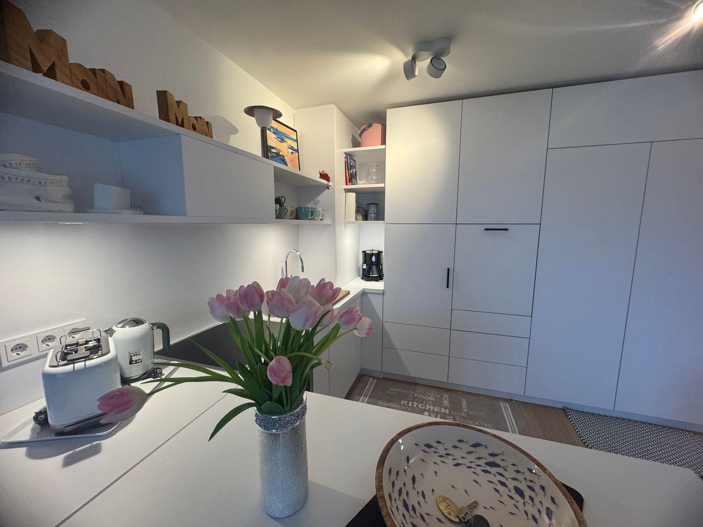 Die Ferienwohnung verfügt über ein helles und freundliches Schlafzimmer mit Parkettboden, wodurch eine angenehme Wohnatmosphäre geschaffen wird. Der offene Wohnbereich lädt zum Verweilen ein und bietet eine gemütliches Sofa zum Entspannen und Genießen Ihrer Lieblingssendungen auf dem großen 44-55 Zoll Fernseher. Hier finden Sie auch einen Esstisch, an dem Sie Ihre eigenen kulinarischen Köstlichkeiten genießen können, die Sie in der gut ausgestatteten Küche zubereiten. Diese ist mit einem Ceranfeld, Backofen, Kühlschrank, Spülmaschine, Wasserkocher, Kaffeemaschine und allen notwendigen Küchenutensilien ausgestattet, um Ihre Kochkünste in vollen Zügen ausleben zu können.