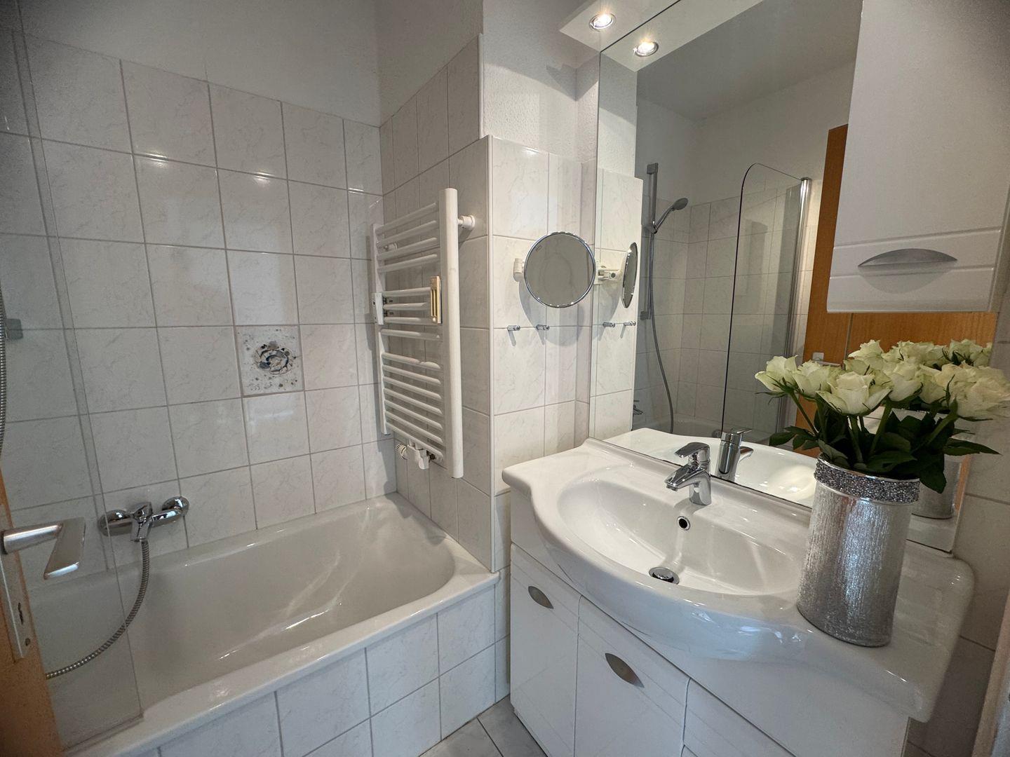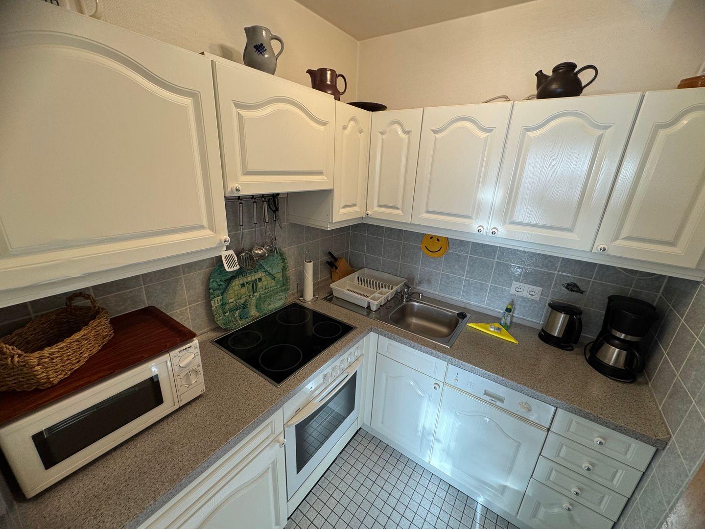 Die Wohnung besticht durch ihre hellen Räume, die eine gemütliche Atmosphäre schaffen. Das Wohnzimmer mit Teppichboden ist mit einem Sofa, einem Sessel und einem Esstisch ausgestattet, der Platz für gesellige Abendessen bietet. Hier können Sie bei einem Filmabend entspannen – ein TV ist ebenfalls vorhanden. Die Wohnung verfügt über eine gut ausgestattete Küche, die mit Cerankochfeld, Backofen, Kühlschrank mit Gefrierfach und Spülmaschine aufwartet. Kochen Sie Ihre Lieblingsgerichte und genießen Sie diese im ebenfalls vorhandenen Essbereich.