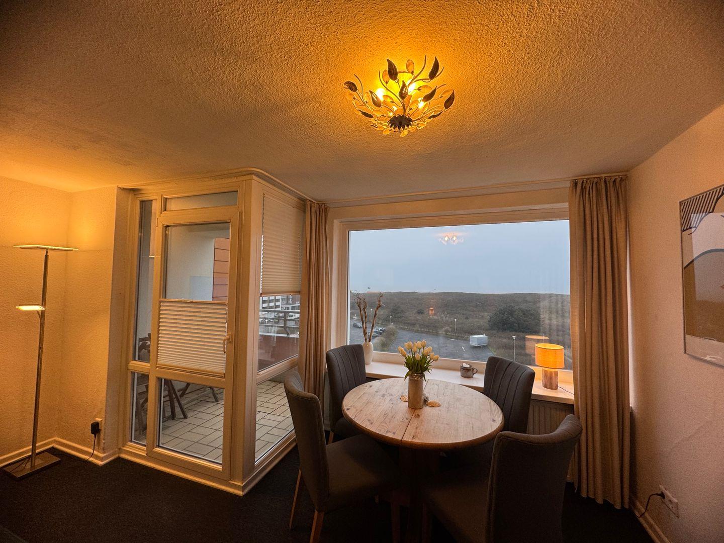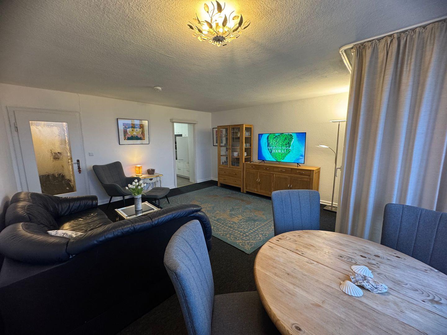 Die Wohnung überzeugt durch ihr durchdachtes Raumkonzept und einladende Atmosphäre. Im hellen und freundlich gestalteten Wohnzimmer finden Sie ein komfortables Sofa und gemütliche Sessel, die zum Entspannen und Verweilen einladen. Ein Esstisch im Wohnzimmer bietet genug Platz für gemeinsame Mahlzeiten nach einem Tag am Strand oder nach einem aufregenden Ausflug in die Umgebung. Die beiden Fernseher sorgen für Unterhaltung, wenn Sie einen ruhigen Abend in der Wohnung verbringen möchten. Der Teppichboden sorgt zudem für ein warmes und gemütliches Wohngefühl.