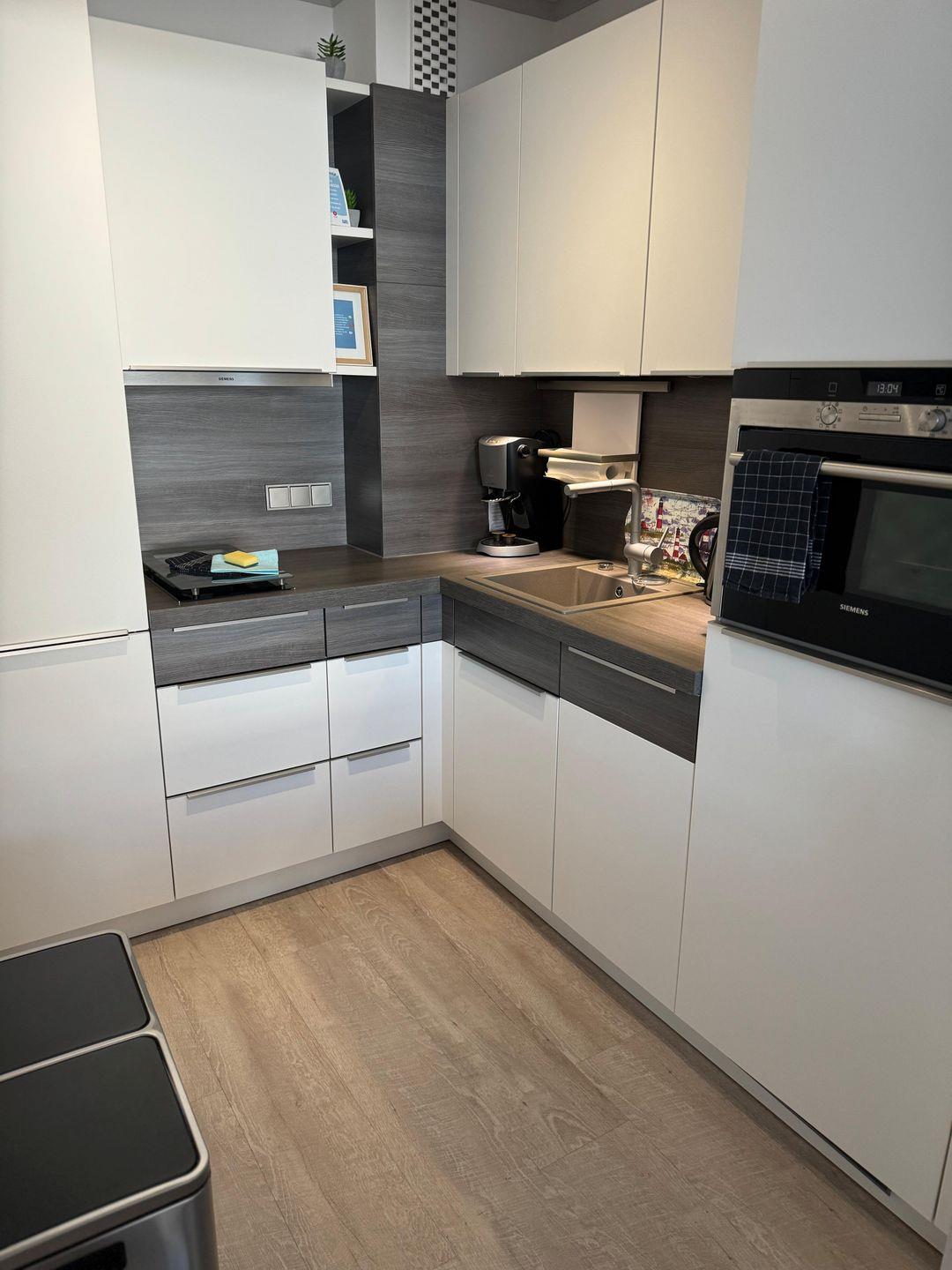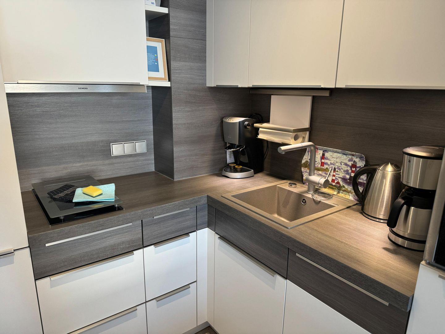 In der neuen Küche erwartet Sie hochwertiges Küchenzubehör von WMF, wie z.B. Kaffeemaschine, Wasserkocher, Toaster, sowie Töpfe und Pfanne. Eine Espressomaschine von Tchibo für den anspruchsvollen Kaffeegenuss (Kapseln bei EDEKA erhältich) ist vorhanden.