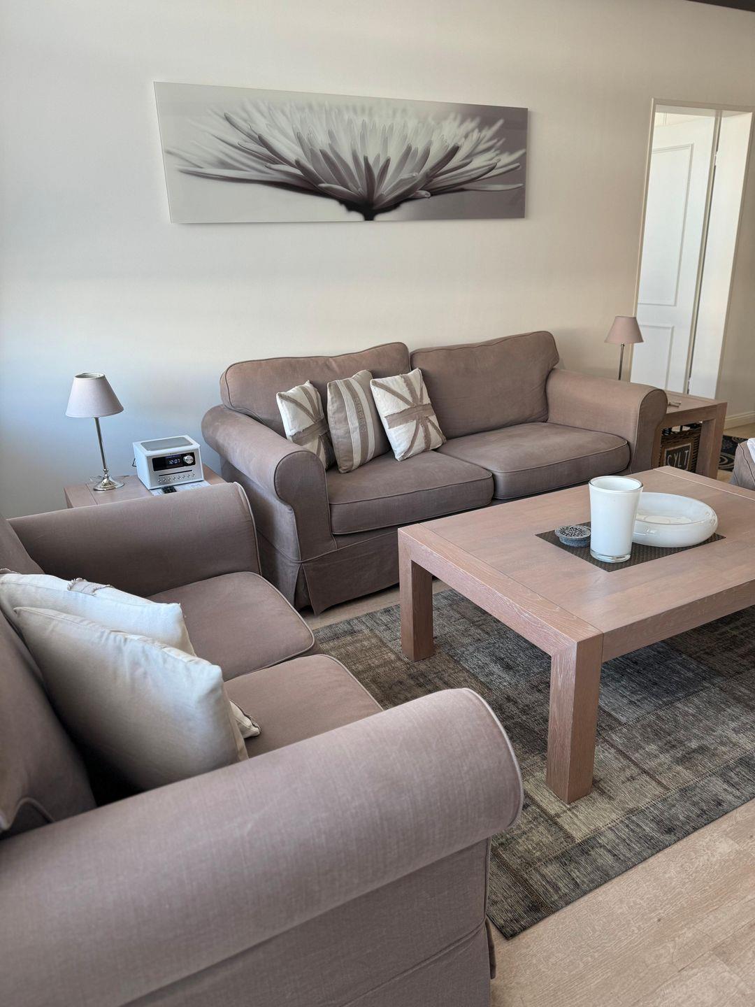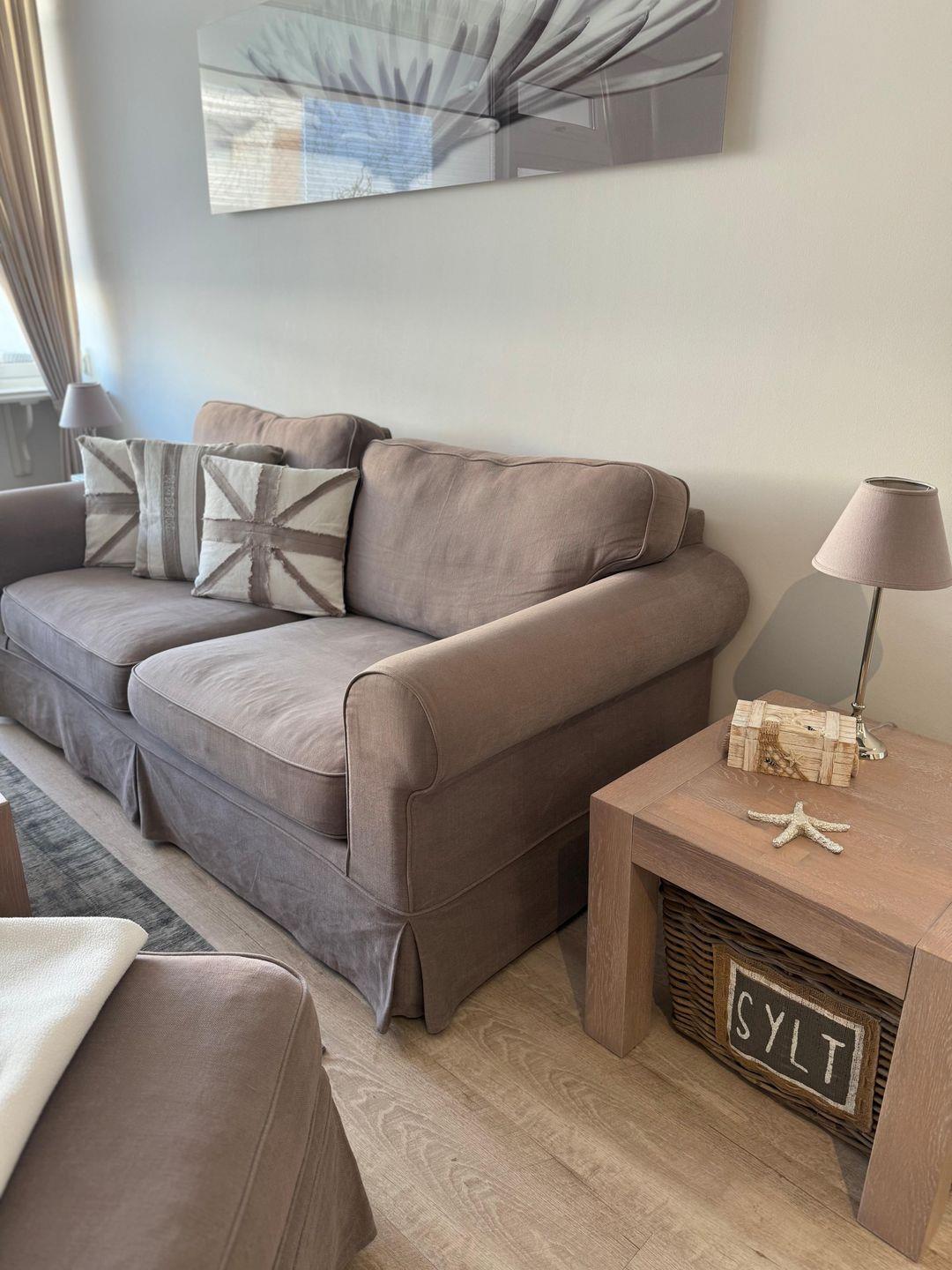 Vom Fur geht es weiter in den sehr hochwertigen, modernen, vom Einrichtungshaus Knutzen ausgestatteten Wohnbereich, mit aufeinander abgestimmten Farbtönen. Das Wohnzimmer ist mit zwei Sofas (keine Schlafsofas) und einem Hocker, Tisch und Beistelltischen ausgestattet. Ein TV Flachbildschirm, eine Radio CD Soundanlage sowie