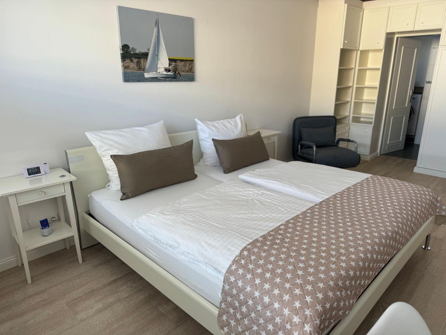 Im seperaten Schlafbereich finden Sie ein hochwertiges Hülstabett (2x2m) mit ebenso guten Hülsta- Matratzen. Ein Schreibtisch ist ebenfalls vorhanden.