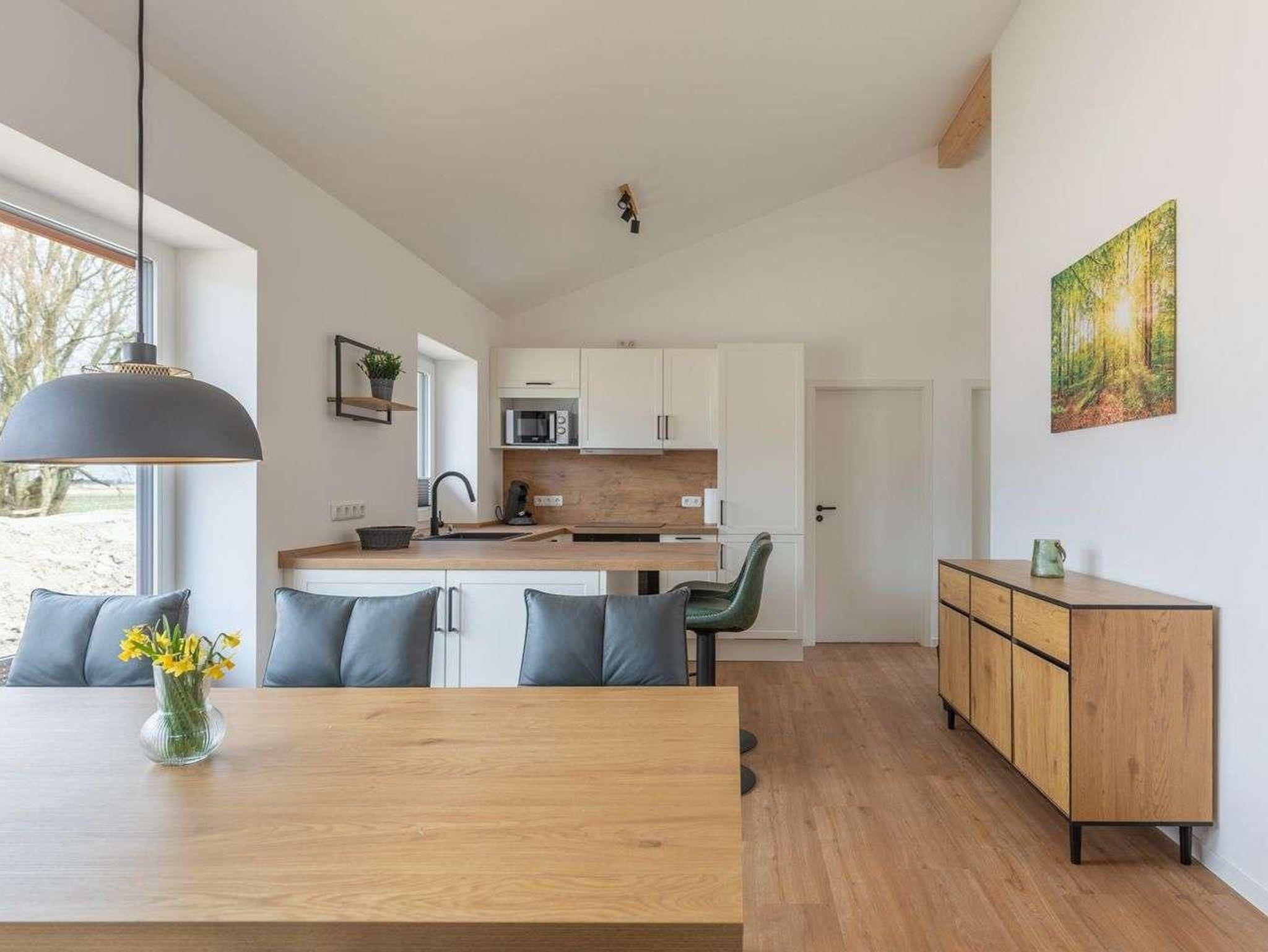 Die offene Küche ist voll ausgestattet mit Induktionskochfeld, Backofen, Mikrowelle, Spülmaschine, Senseo-Kaffeemaschine und Kühlschrank mit Gefrierfach – perfekt für gemeinsame Kochabende. Im gemütlichen Wohnbereich laden eine Sofaecke und ein SMART-Fernseher zum Verweilen ein. Kostenloses, schnelles WLAN hält Sie jederzeit online. Der angrenzende Essbereich bietet ausreichend Platz für alle Gäste.