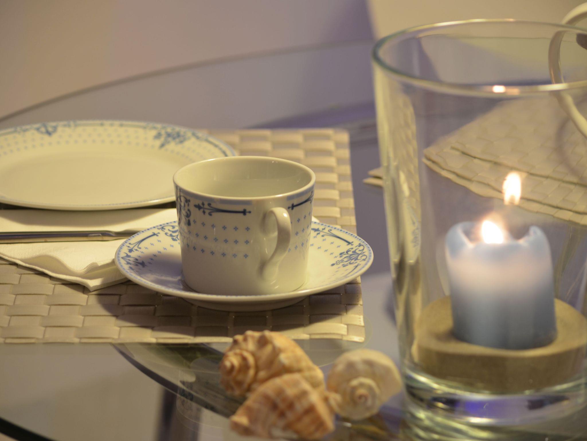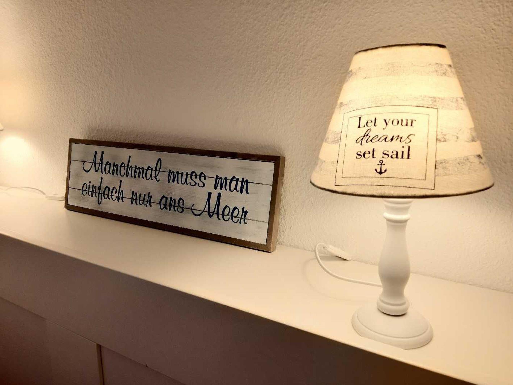 Die ganze Wohnung ist mit hellem, nordisch anmutendem Fußboden ausgelegt und in Weiß mit maritimen Elementen gehalten.
