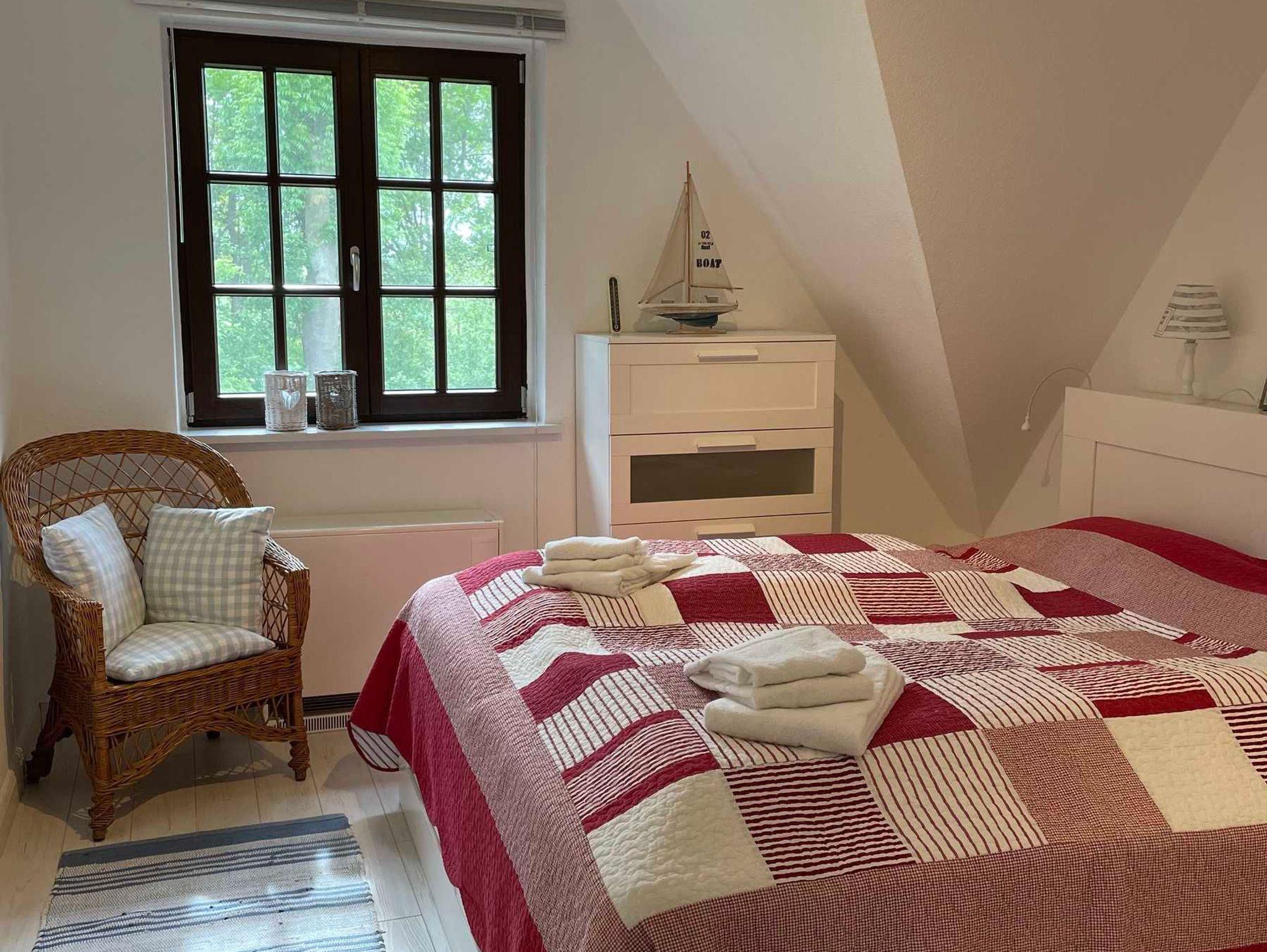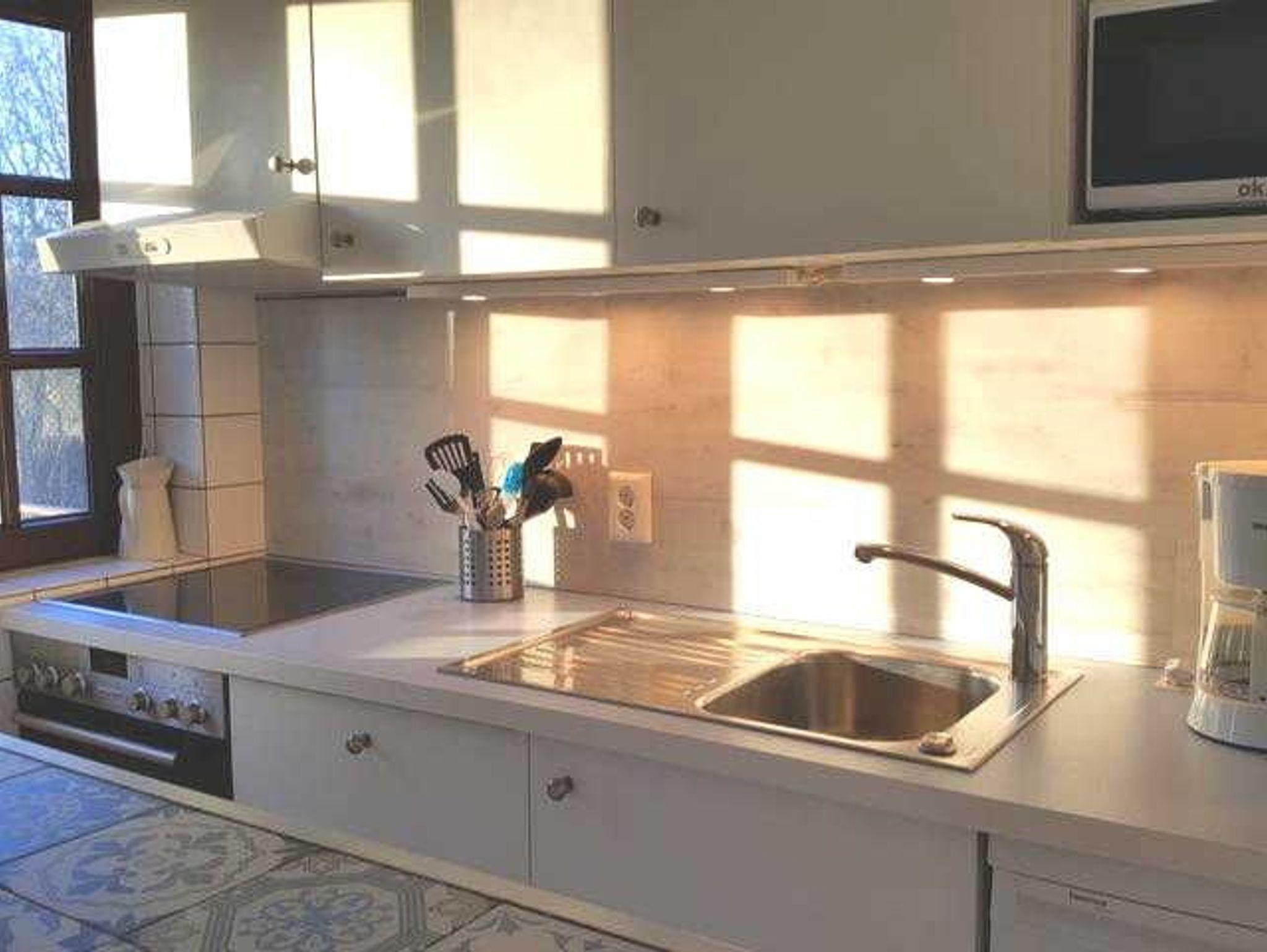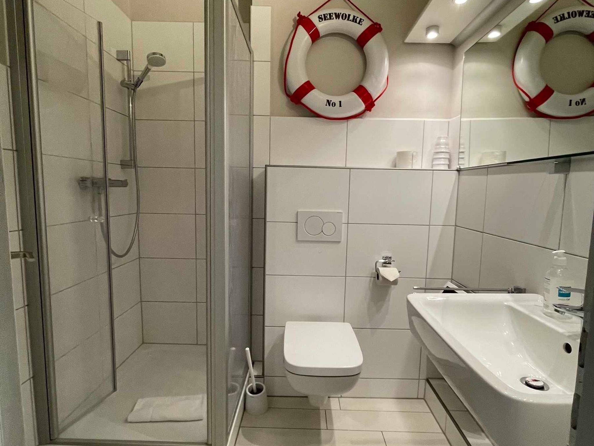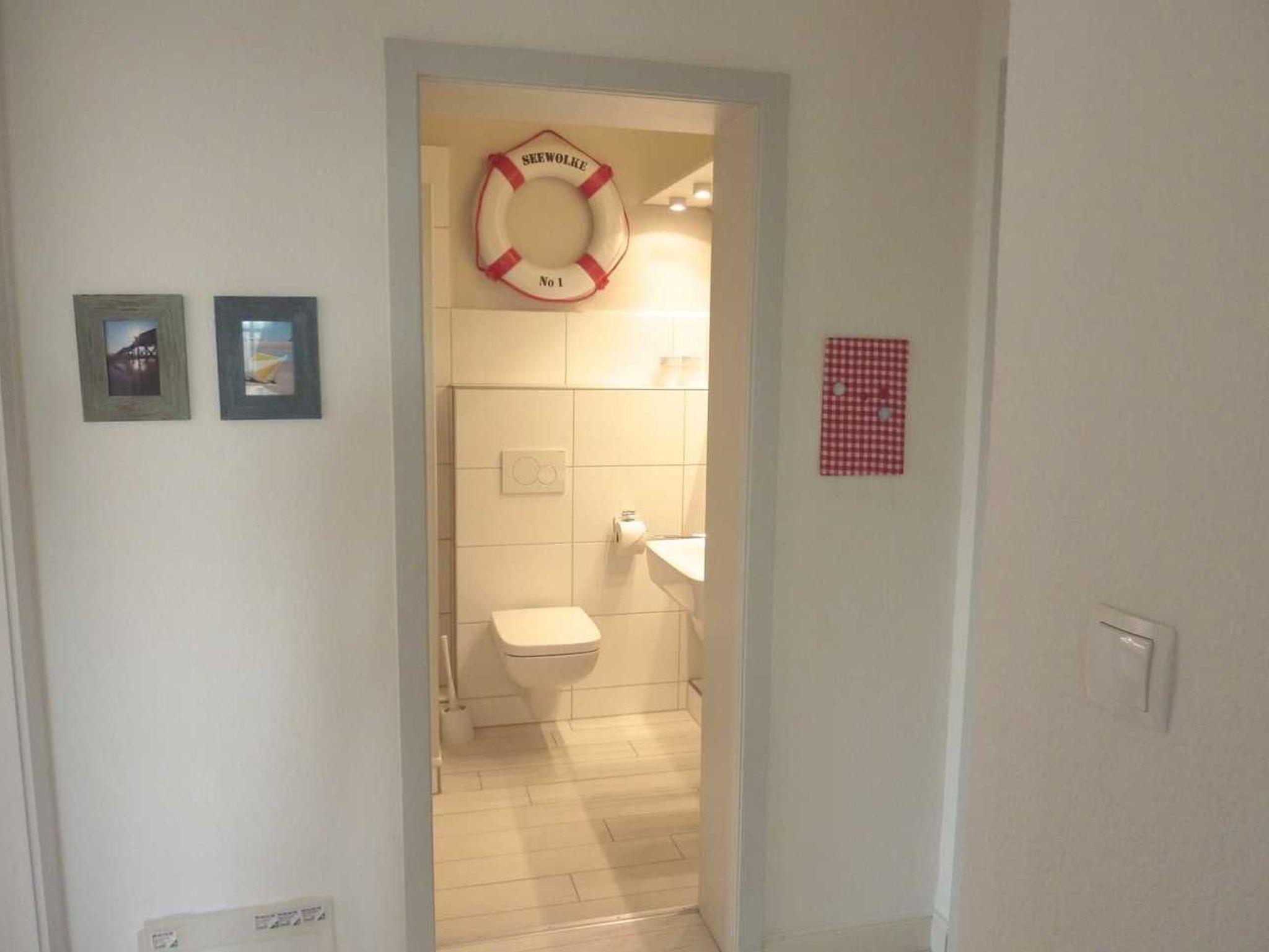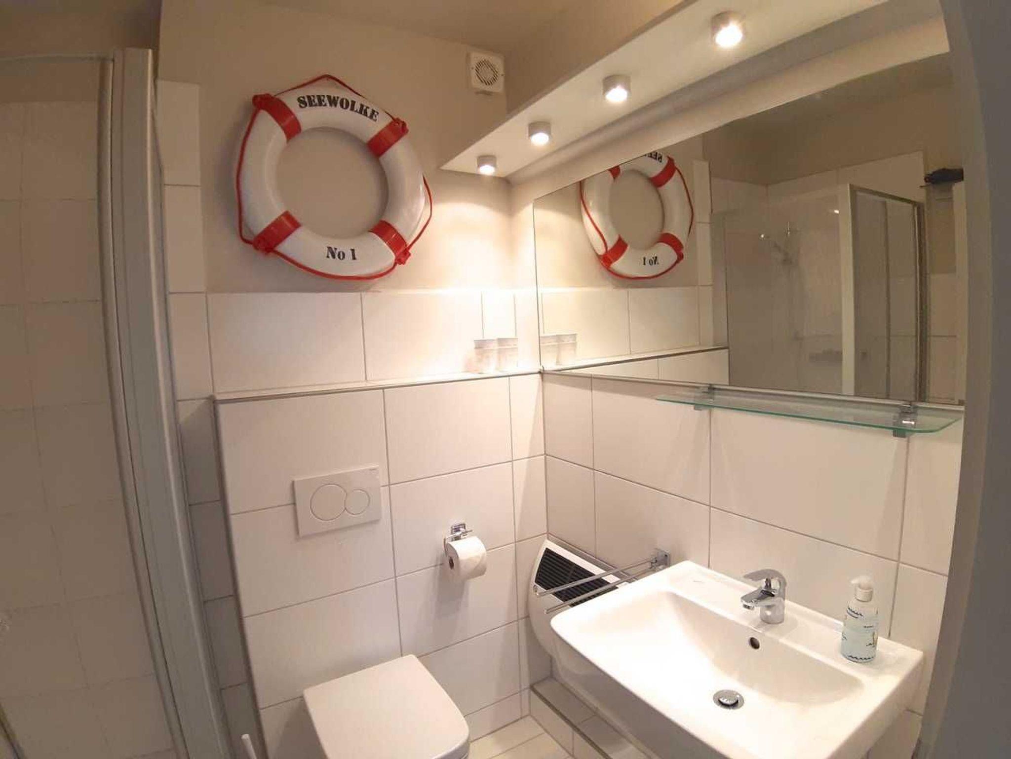 SEEWOLKE besteht aus einem Wohn-/Esszimmer mit breiter Schlafcouch (1,60m x 2m), einem Schlafzimmer mit Doppelbett, einer voll ausgestatteter Küche mit Fenster: 4 Platten Ceranherd mit Backofen, Geschirrspüler, Kühlschrank mit Gefrierfach und Mikrowelle, sowie ausreichend Geschirr und Gläsern (8-fach), TCHIBO Espresso-Kapselmaschine, Töpfen etc., einem Flur, einem modernen, hellen Duschbad und einem praktischen Abstellraum. Gegen störende Mücken in der Nacht befinden sich an vielen Fenstern Insektenschutzrahmen.