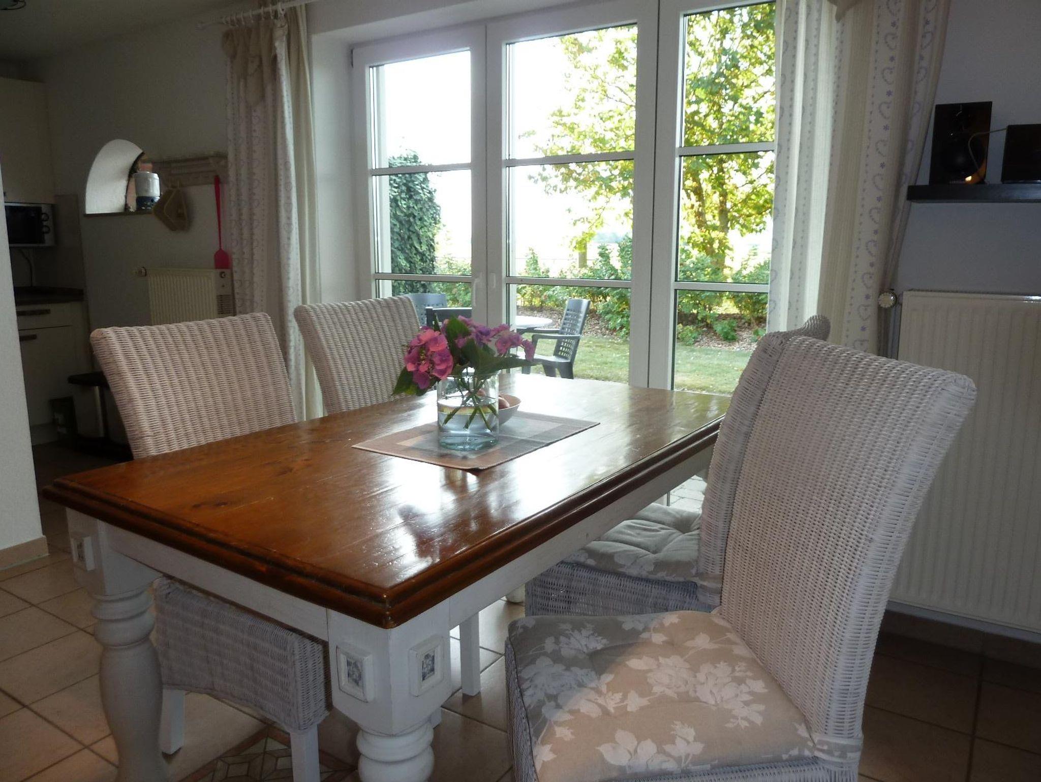 Eine komplett ausgestattete moderne Landhausküche inspiriert Sie zum Kochen. Die Küche ist zum Wohnraum offen, liegt aber in einer Nische.