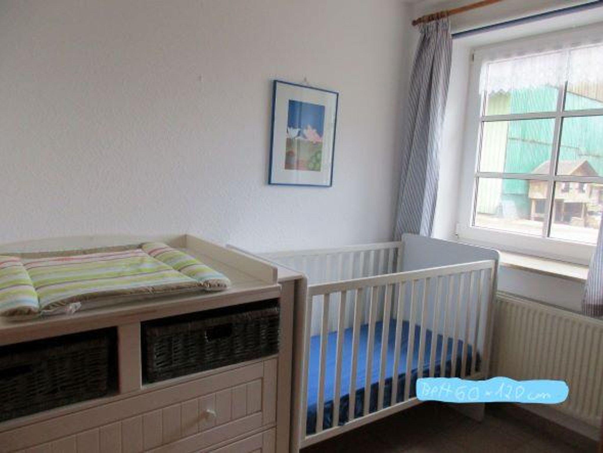 Das Kinderzimmer ist ebenfalls mit Verdunklungsrollos und Fliegengittern vor den Fenstern ausgestattet. Ein Etagenbett erfüllt den Wunsch vieler Kinder. Für unsere Kleinsten halten wir ein Gitterbett und einen Rausfallschutz bereit. Auch eine Wickelkommode steht im Zimmer.