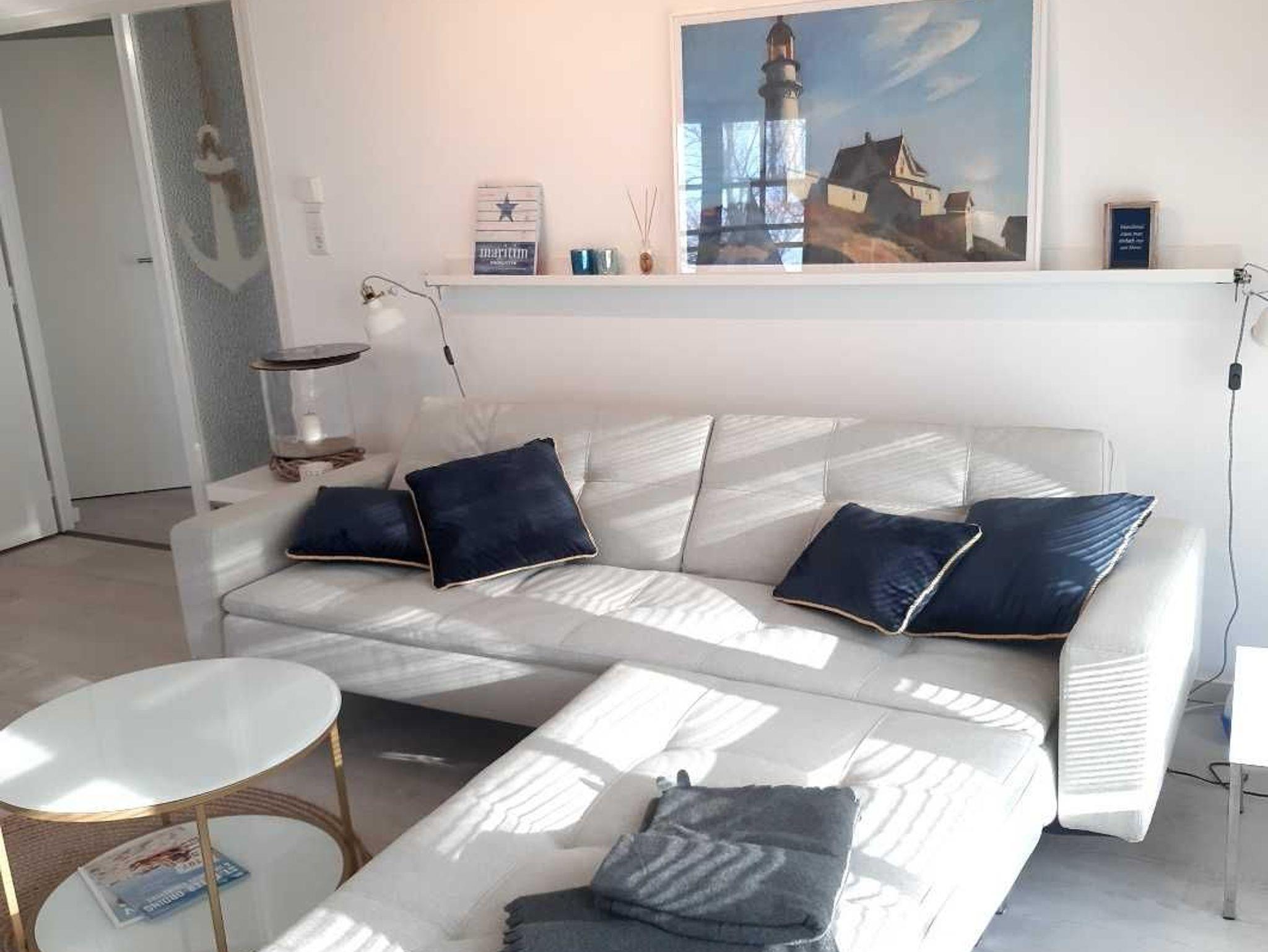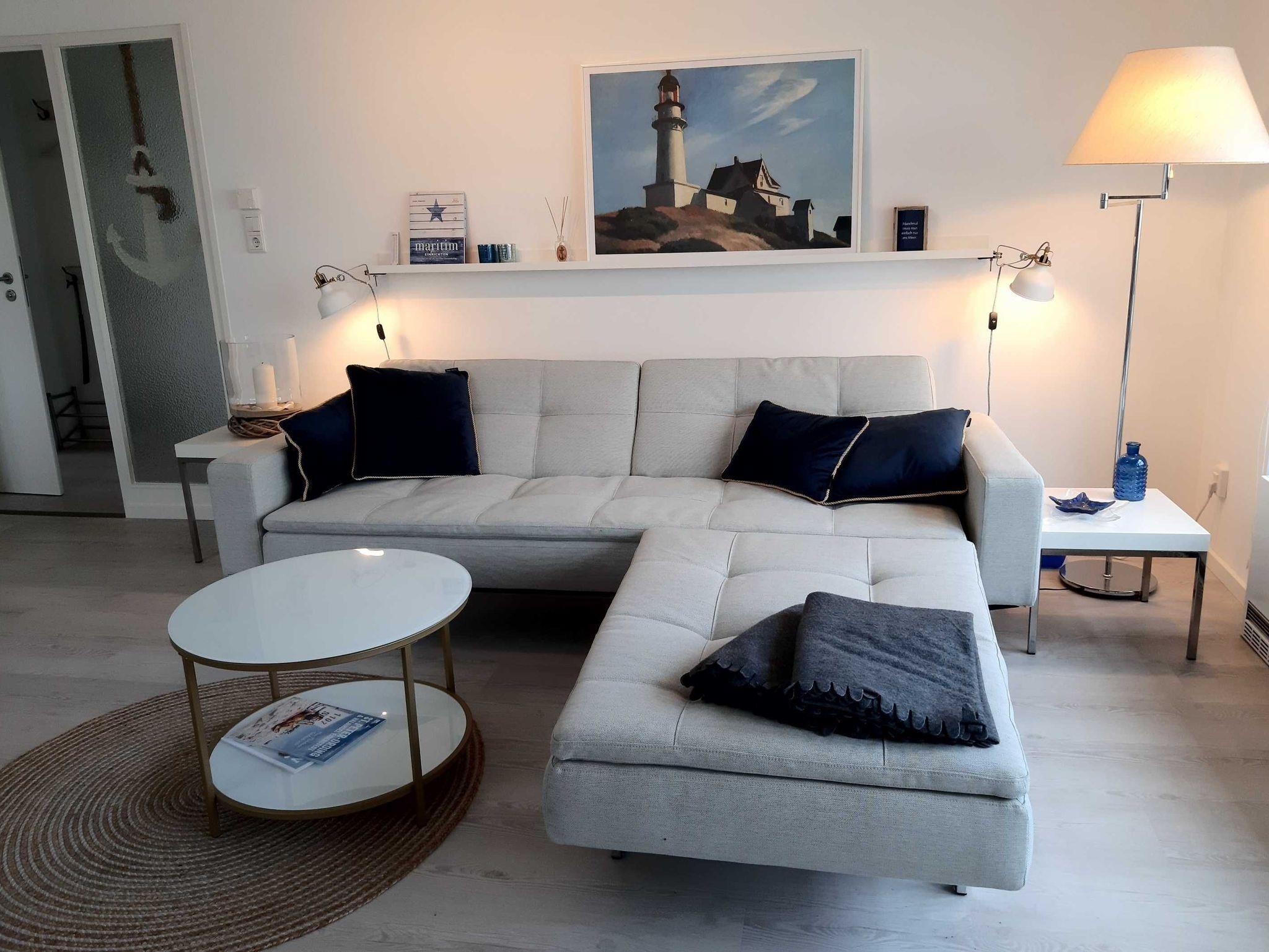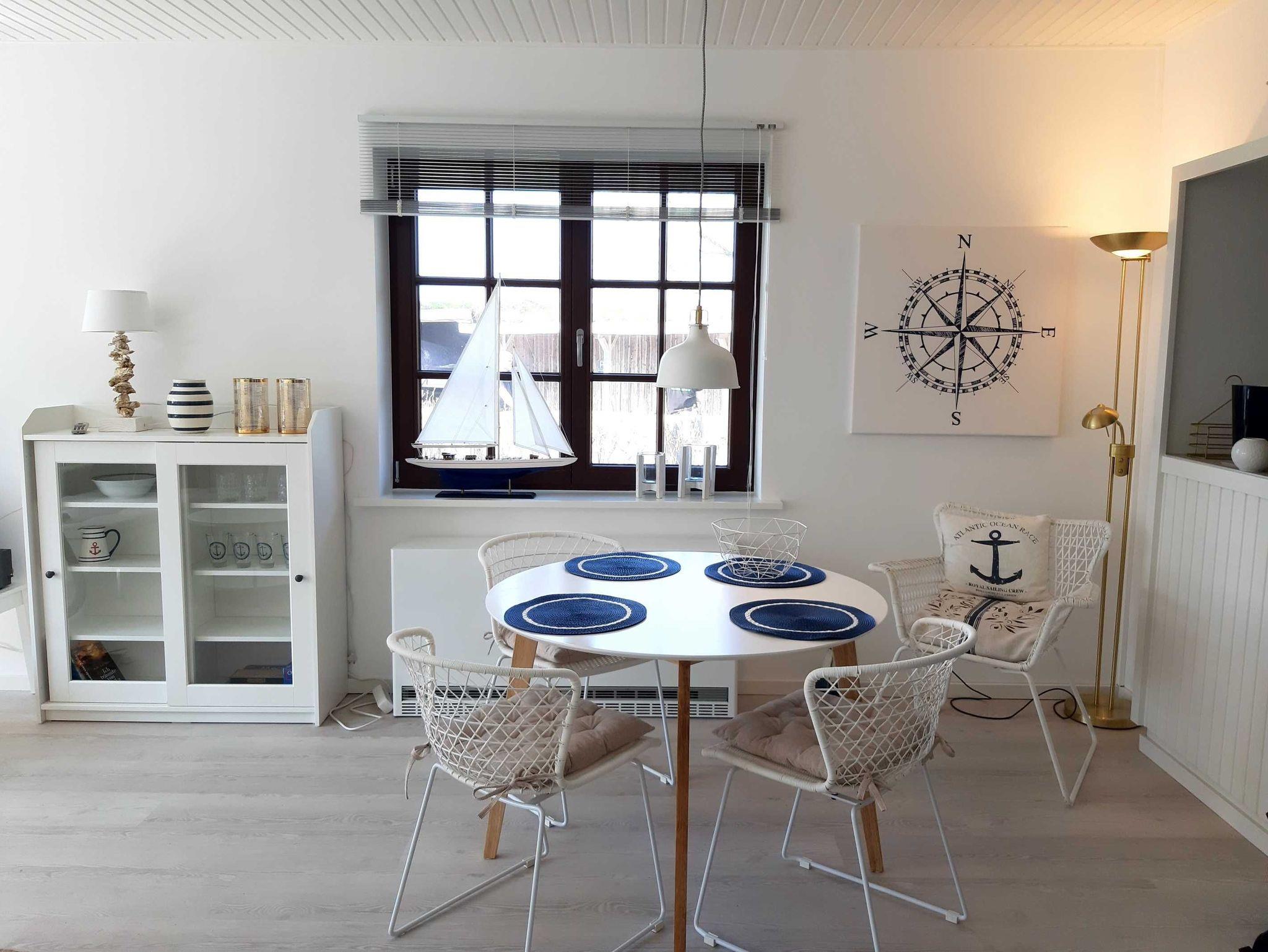 Die ganze Wohnung ist mit nordisch anmutendem Fußboden ausgelegt und nordseemäßig mit maritimen Elementen dekoriert.