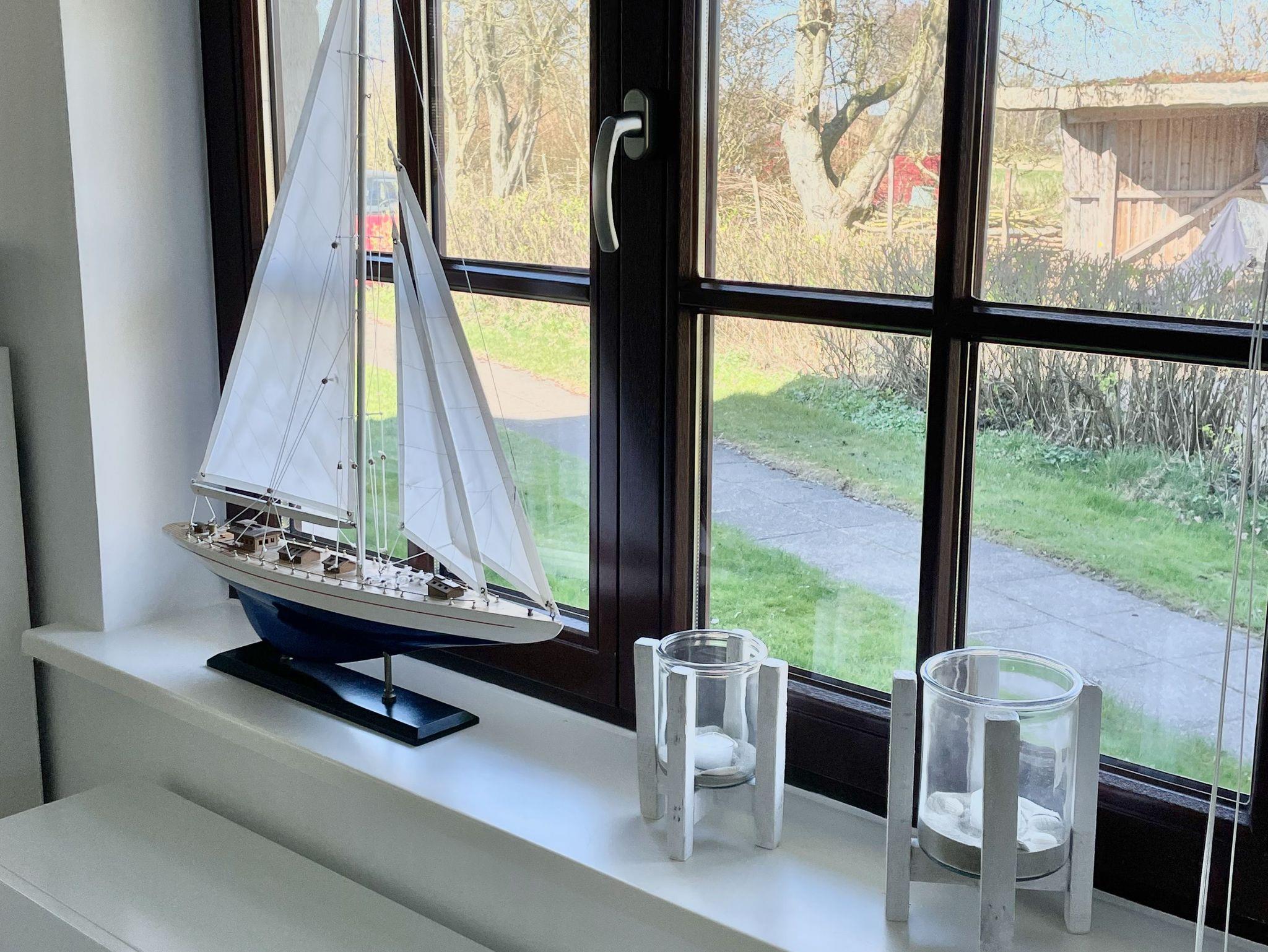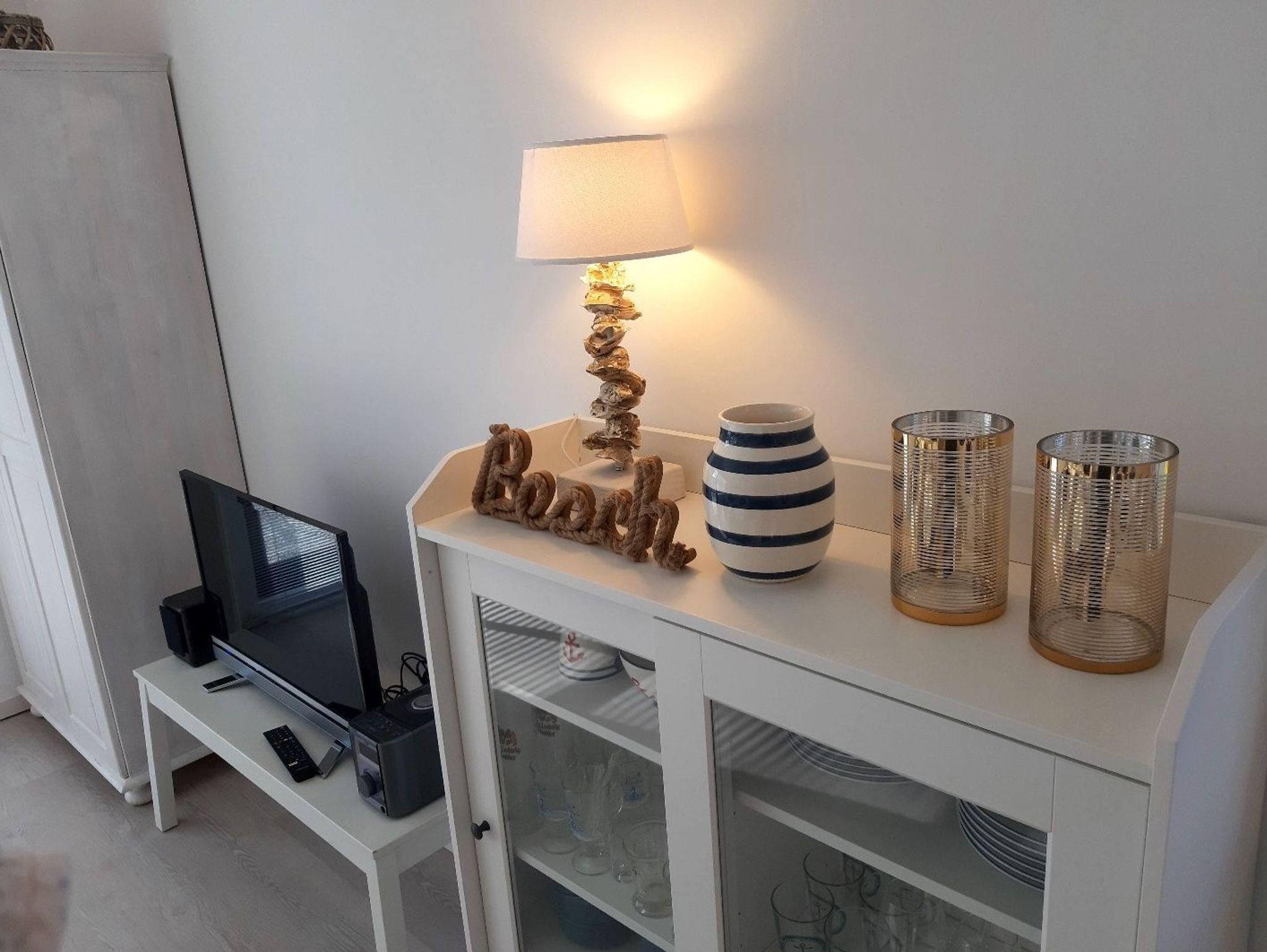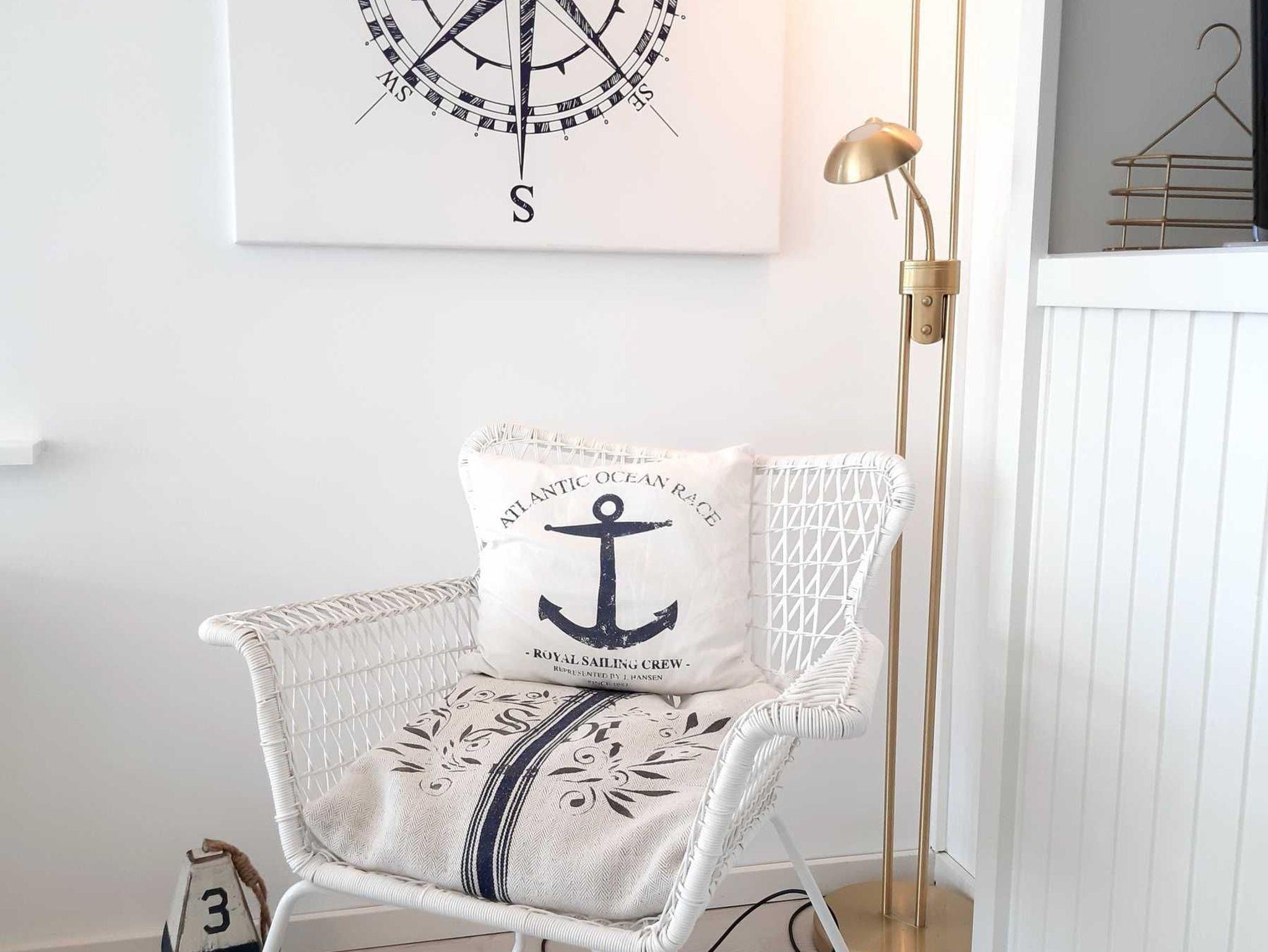 Die ganze Wohnung ist mit nordisch anmutendem Fußboden ausgelegt und nordseemäßig mit maritimen Elementen dekoriert.