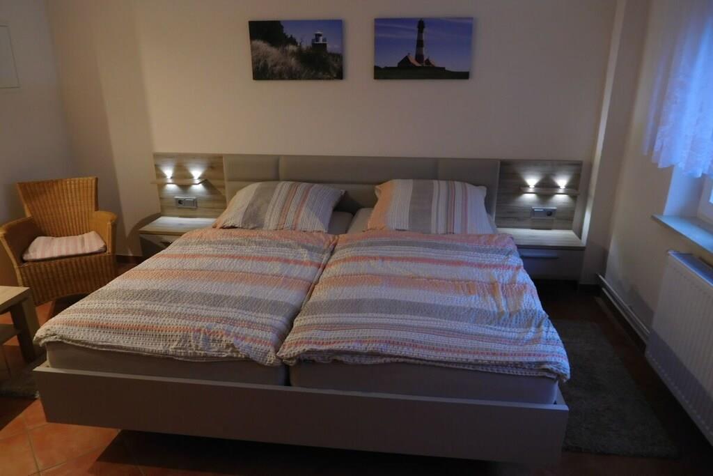 Die komplett eingerichtete Ferienwohnung liegt im Hinterhof eines Einfamilienhauses, in ruhiger Lage und unmittelbarer Nähe zum Eiderdeich im Ortsteil Olversum. Die Einbauküche ist ausgestattet mit Cerankochfeld mit 4 Platten, Kühlschrank mit Gefrierfach und Sitzgelegenheiten für 4 Personen. Das Wohn- und Schlafzimmer hat eine gemütliche Sitzecke und ein Doppelbett sowie Fernseher mit SAT-TV. Das kleine Schlafzimmer hat ein Etagenbett für 2 Kinder. Alle Räume sind lichtdurchflutet und liebevoll eingerichtet. Der grüne Badestrand und das Meerwasser - Schwimmbad sind nur ca.250 m entfernt. Zum Eiderdeich ca.30 m und zum Wasser ca. 50 m. Das kleine Schlafzimmer ist Anfang 2022 renoviert und neu eingerichtet worden. Das Badezimmer ist 2019 saniert worden.