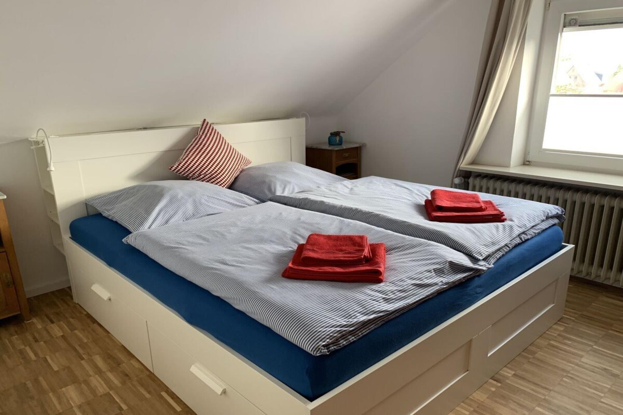 1-4 Personen könne bequem in den 48 qm im 1. Obergeschoß ihren Urlaub nahe der Nordsee genießen. Sie haben hier einen eigenen Eingang mit einer Holztreppe nach oben. Schlafzimmer mit großen Doppelbett ( 1,80 m x 2.00 m), Bitte daran denken ein großes Bettlaken mitzubringen .1 extra Bett ( 1m x 2,00 m) Im Wohnzimmer steht eine Schlafcouch (1,40m x 2,00 m). Der Wohnbereich lädt durch eine offene Wohnküche mit gemütlicher Essecke ein.( Geschirrspüler, Toaster, Kaffeemaschiene, Mikrowelle) . Wohnzimmer mit Couch / Schlafcouch und Sessel und einem Fernseher . Im Badezimmer befindet sich eine Badewanne . Im Garten gibt es eine Sitzecke für Sie . Gerne dürfen Sie ihren eigenen Grill mitbringen