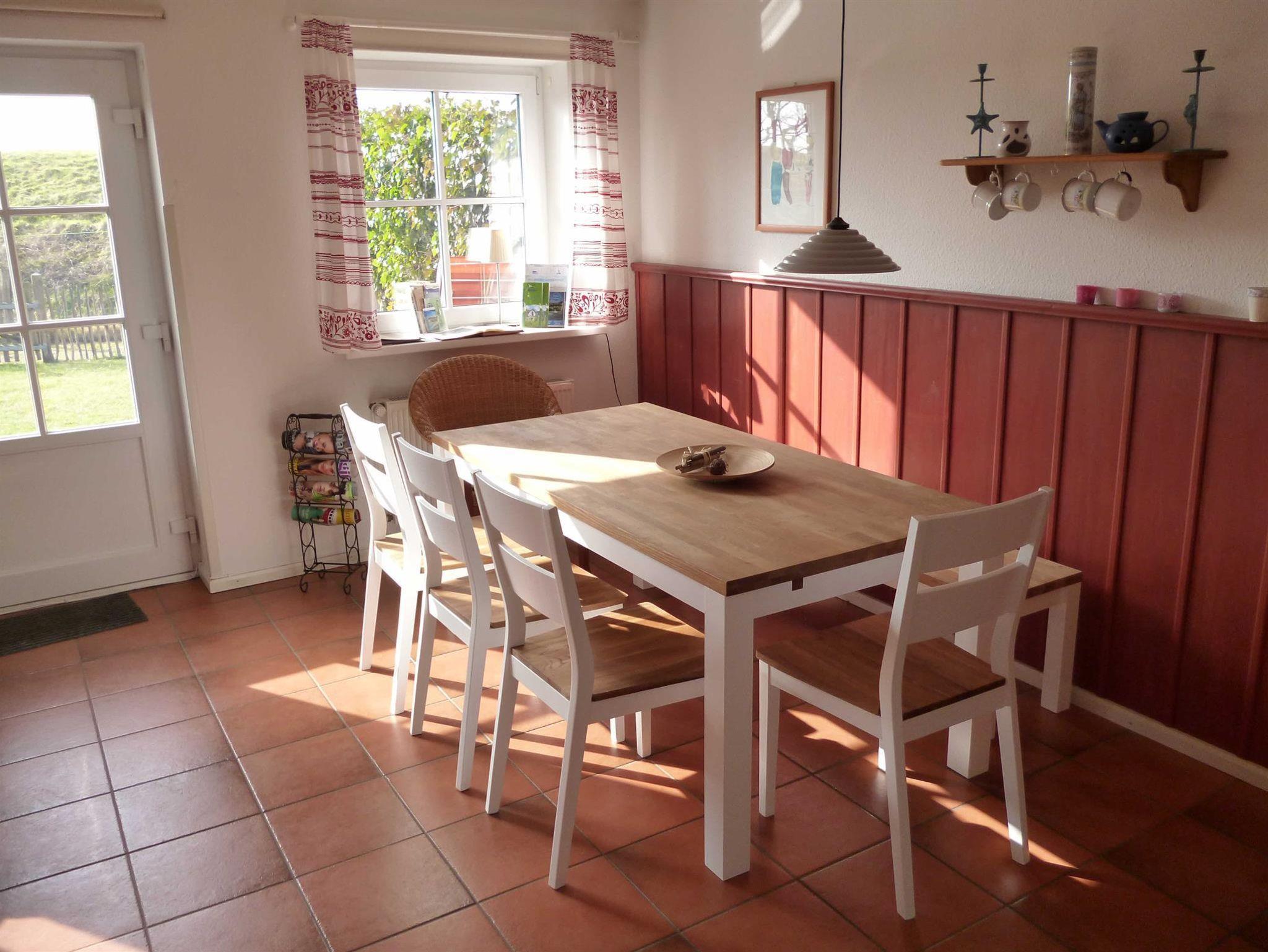 Das Haus hat 3 Schlafräume (Doppelzimmer, Dreibettzimmer, kleines Zimmer mit einem Bett) und bietet 6 Erwachsenen Personen auf 85m² Platz. Bettwäsche kann für 20,00 €/Person über den Vermieter dazu gebucht werden. Für kleinere Kinder ist ein höhen- und größenverstellbarer Tripp-Trapp-Stuhl vorhanden. In der perfekt ausgestattete Küche mit Herd (Cerankochfeld), Geschirrspüler, Kaffeemaschine, Toaster, Eierkocher, Wasserkocher und Handrührgerät , finden Sie außerdem ausreichend Geschirr im friesischen Stil vor.