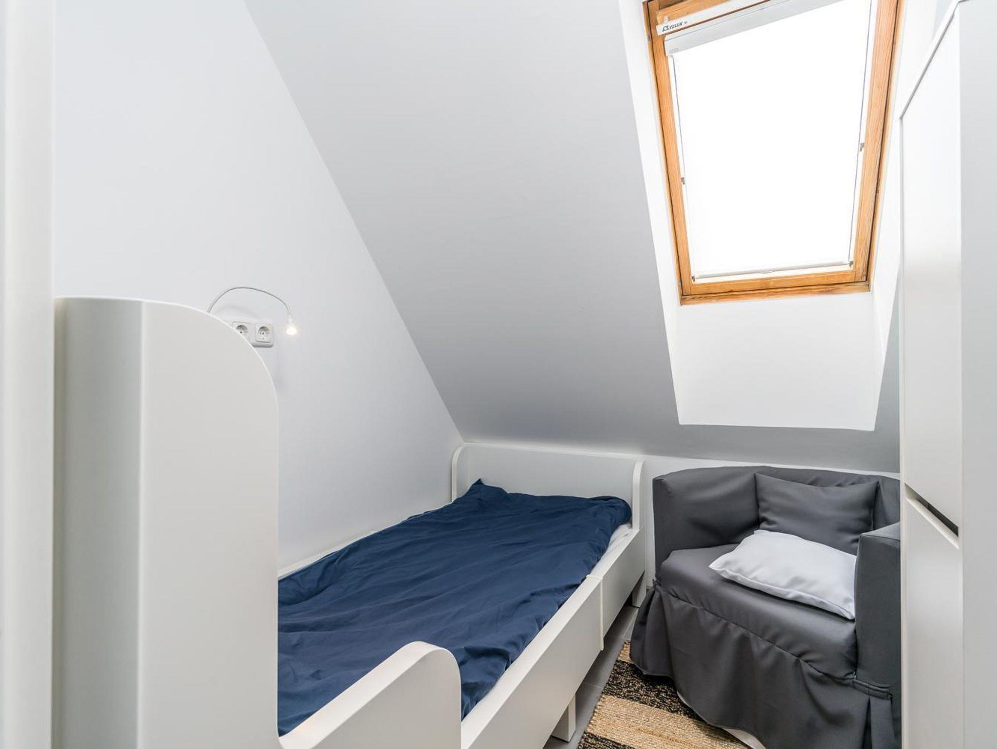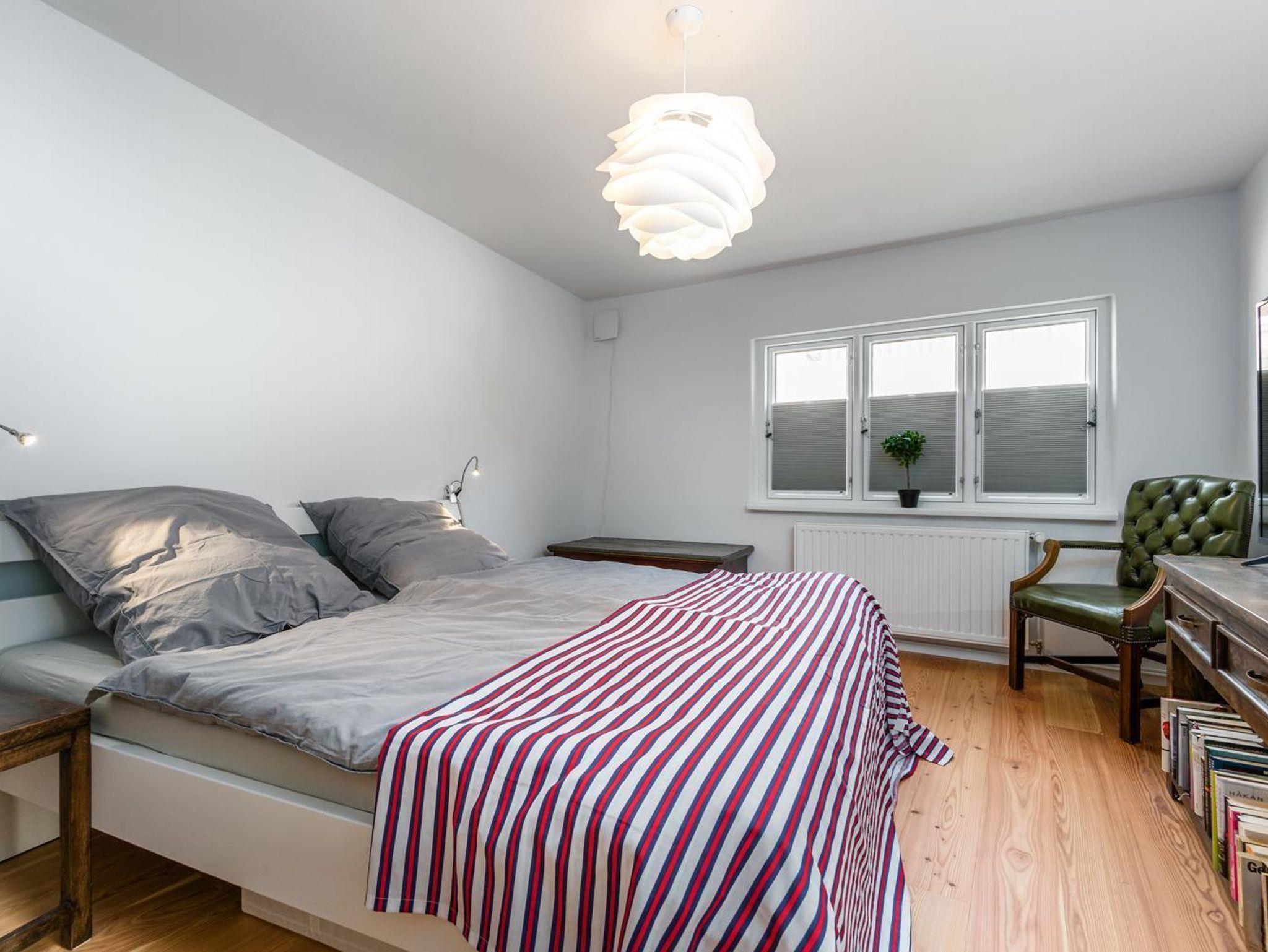 Durch den Flur kommen Sie bequem über das Treppenhaus ins Obergeschoss in dem sich das zweite sehr großzügige zur Decke offen gestaltete und helle Schlafzimmer befindet. Ebenfalls lädt dieses ideal zum Lesen und Entspannen ein. Das Bett mit einer Größe von 160x200cm ist zum Relaxen perfekt. Auch dieses Schlafzimmer verfügt über einen Fernseher.