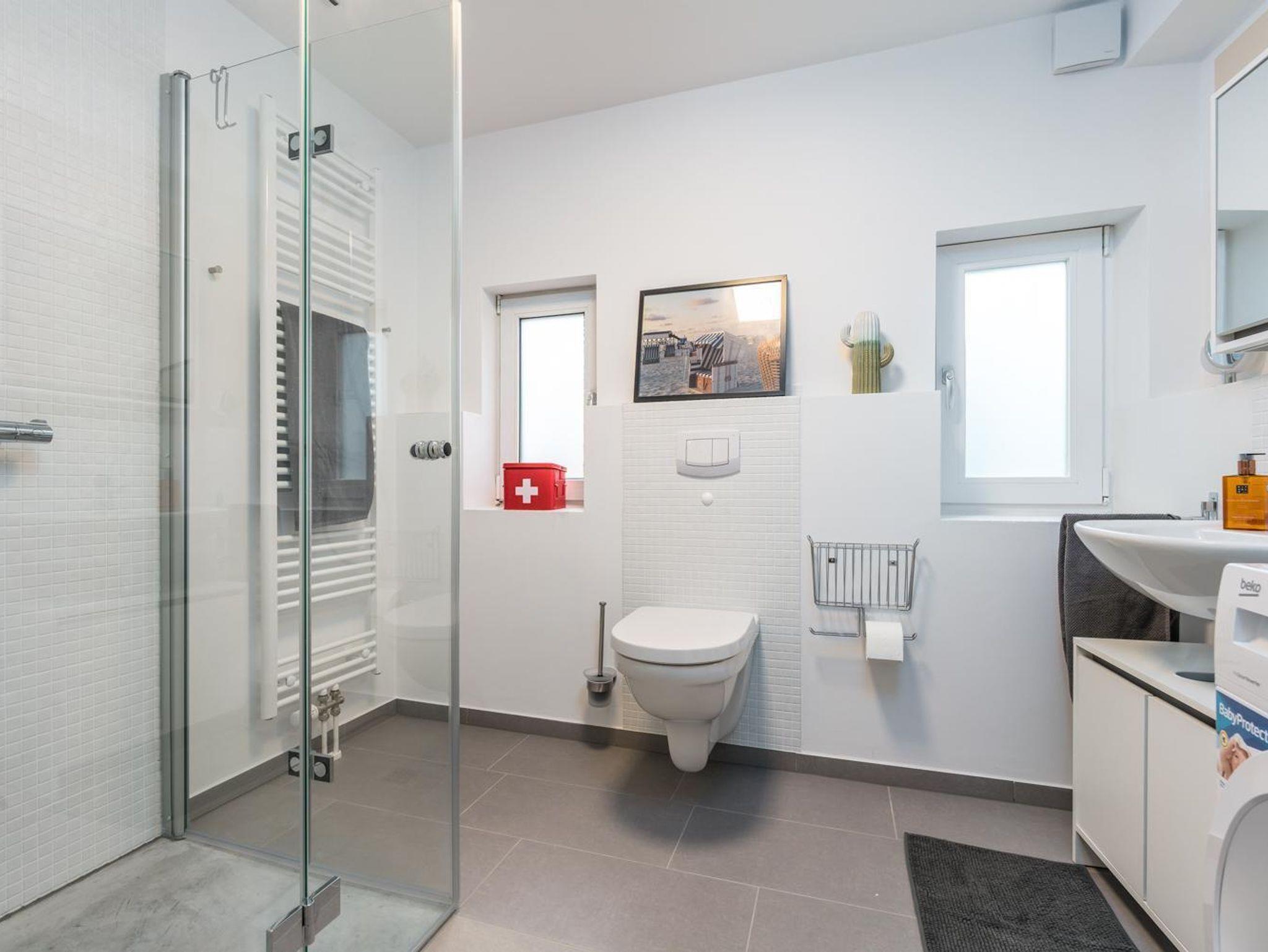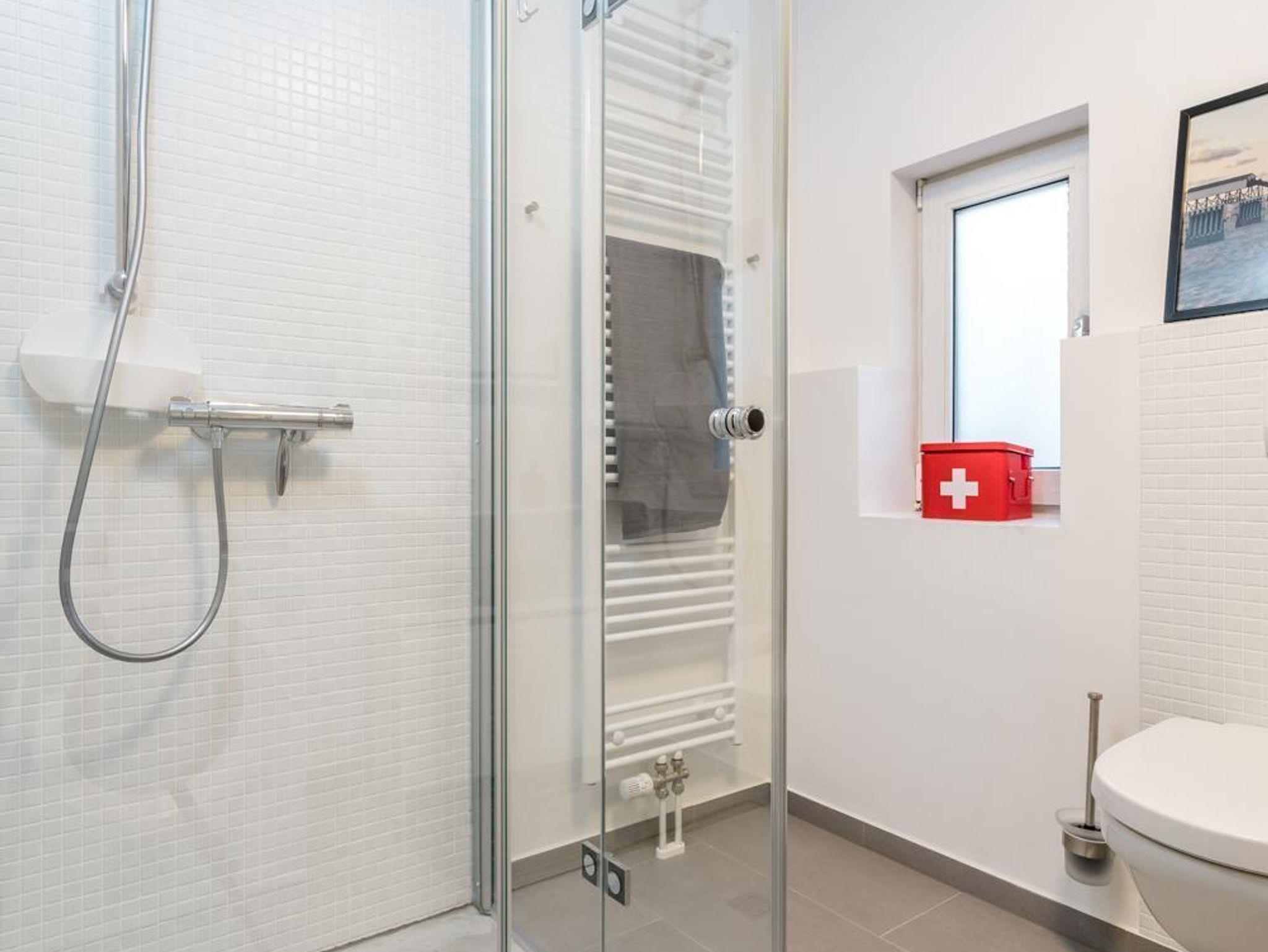 Es folgt die Küche mit Spülmaschine, einem Herd, Tiefkühlfach, und Kühlschrank, einer Nespresso sowie normaler Kaffeemschine und Mikrowelle. Von der Küche aus geht es in den kleinen Innenhof. Hier können Fahrräder abgestellt werden. Der Innenhof ist auch zur Straße mit einer Tür gesichert. Ein großes Bad mit ebenerdiger Dusche , WC und Waschbecken sowie Waschmaschine und Trockner befinden sich ebenfalls im Untergeschoss. Fön, Handtücher sind vorhanden.