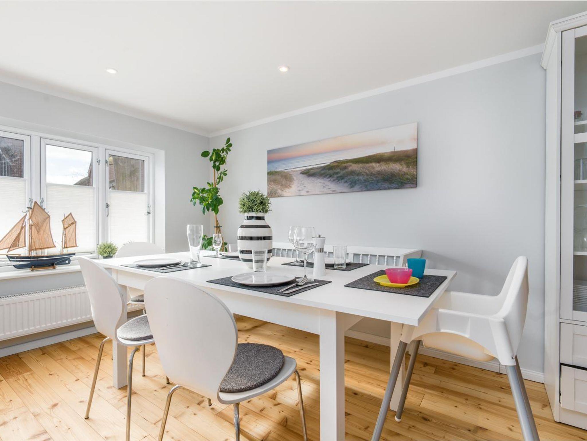 Im Untergeschoss befindet sich ein geräumiger Flur. Vom Flur aus geht es in ein großzügiges Esszimmer mit einladenden Esstisch an welchen mindestens 8 Personen Platz finden. Ein Hochstuhl ist vorhanden. Das Esszimmer geht in das Wohnzimmer über. Dies lädt mit zwei gemütlichen Sofas und einem dänischen Ofen zum Lesen, Verweilen, Schnacken oder Fersehschauen ein.