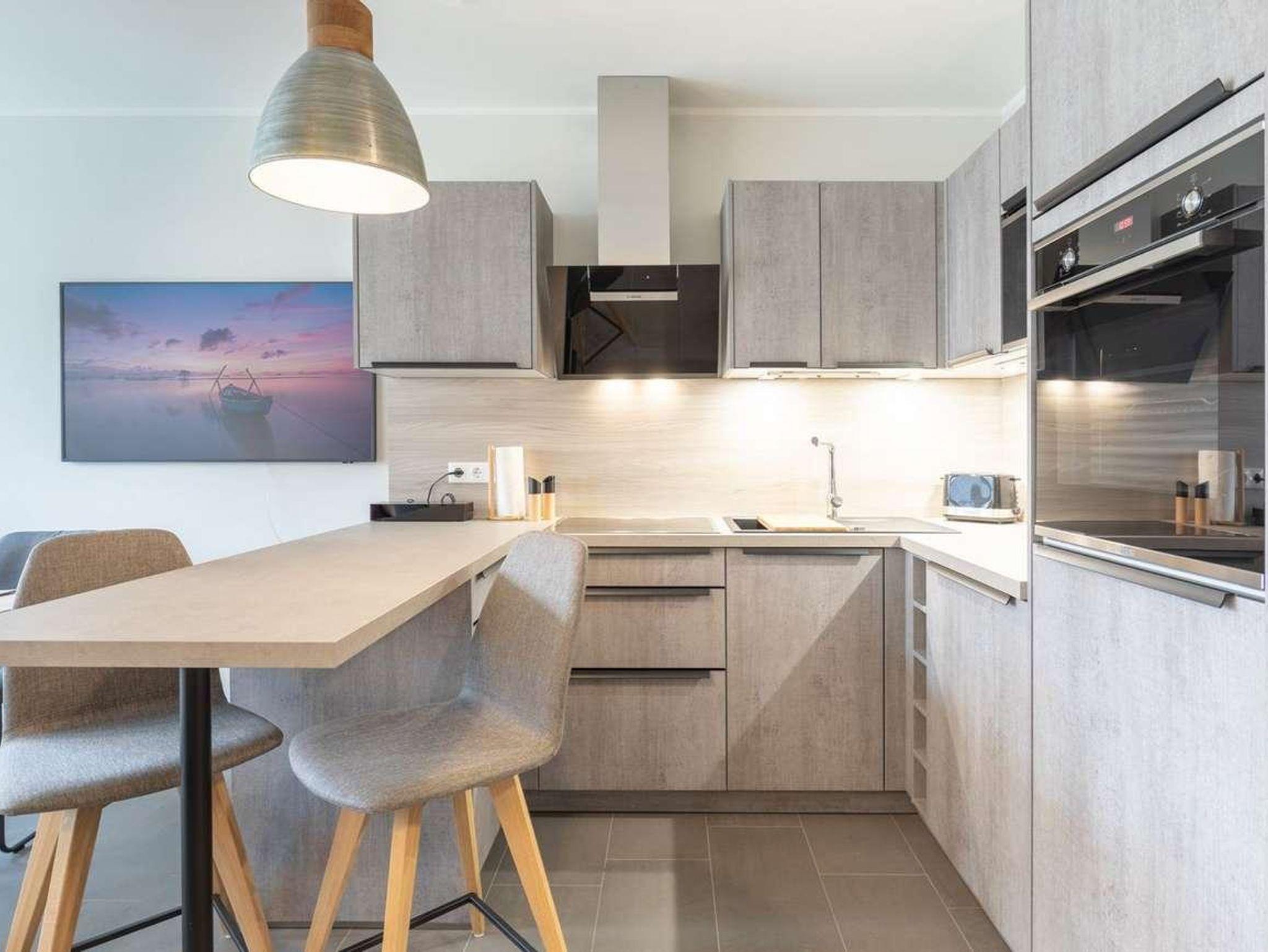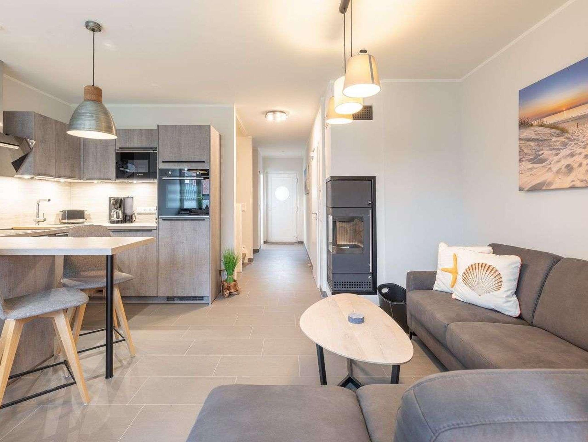 Das ca. 95 qm große Ferienhaus über drei Ebenen empfängt Sie mit einem großzügigen und lichtdurchfluteten Wohnraum mit einer offenen, sehr gut ausgestatteten Küche (Ceranfeld-Herd mit Dunstabzugshaube, eine Geschirrspülmaschine, einen großen Kühlschrank mit Gefrierfach, einen Backofen, Wasserkocher und Toaster).