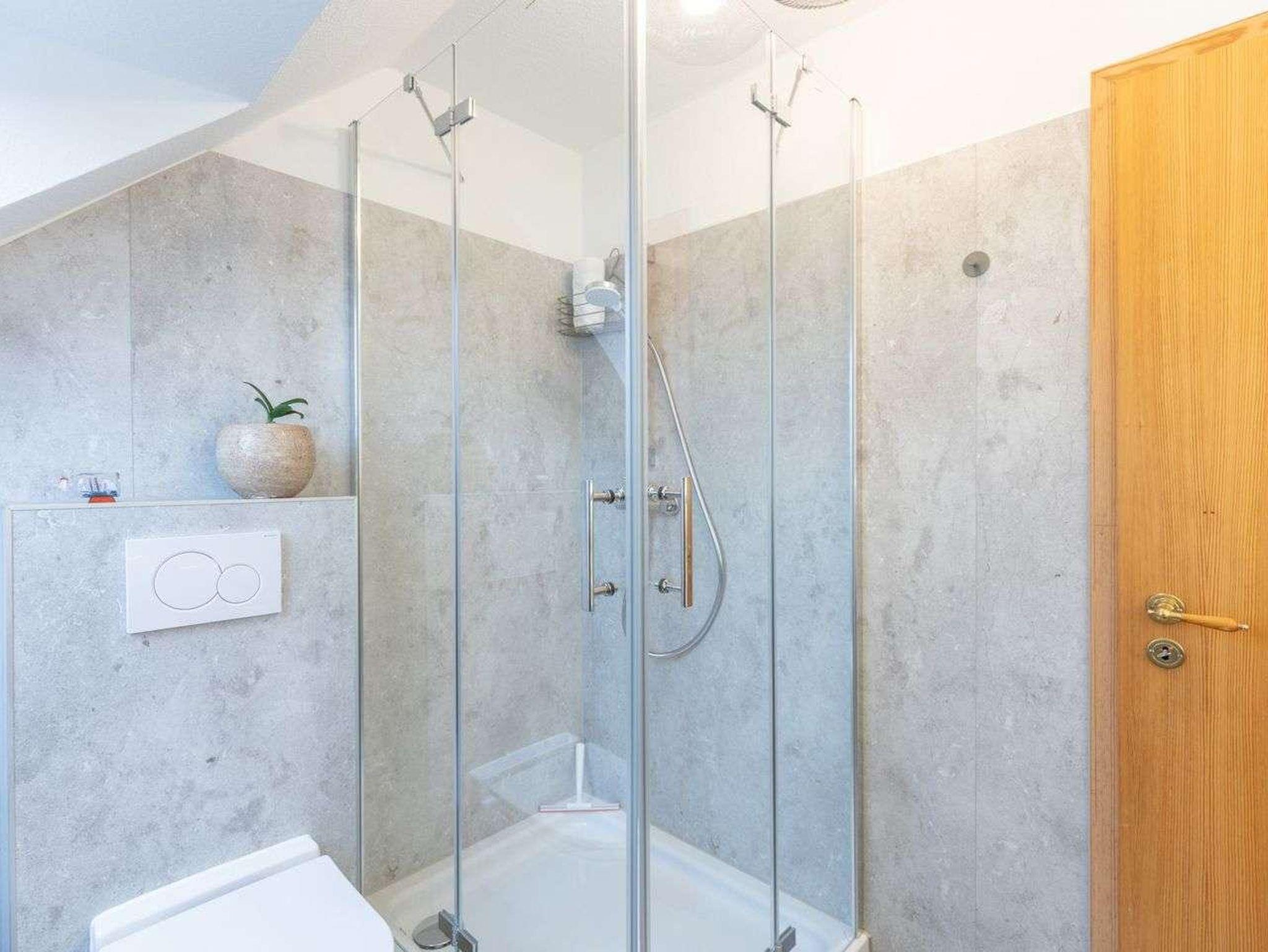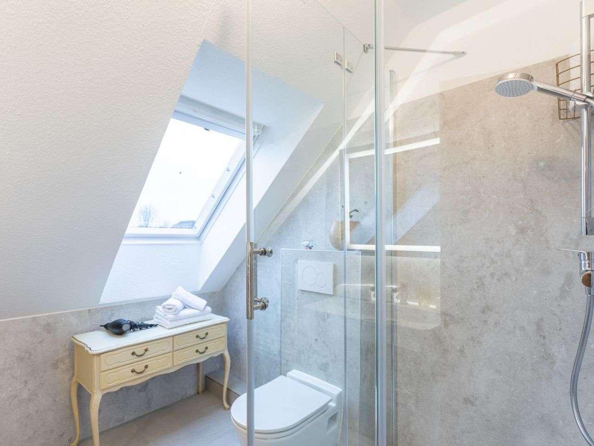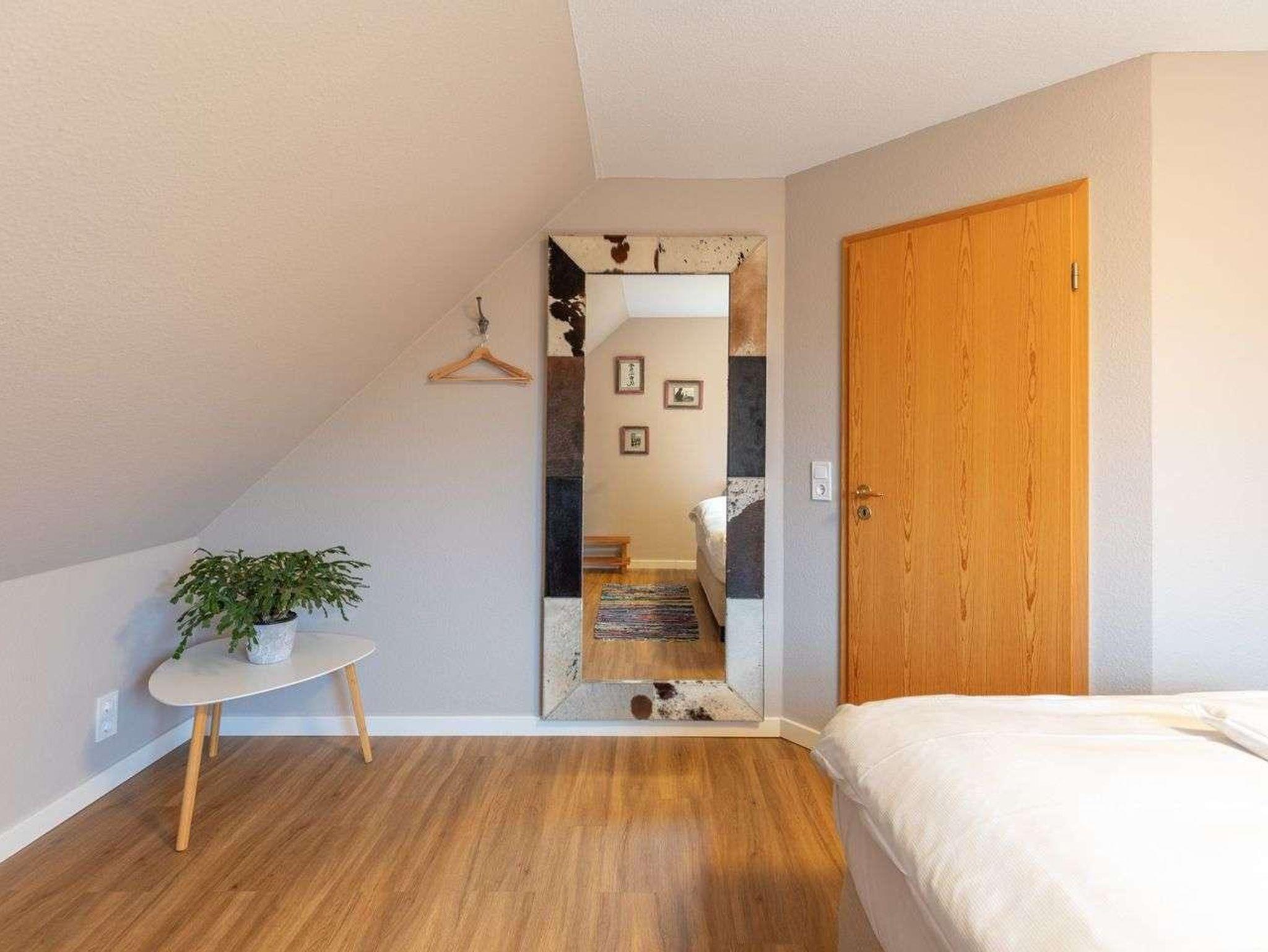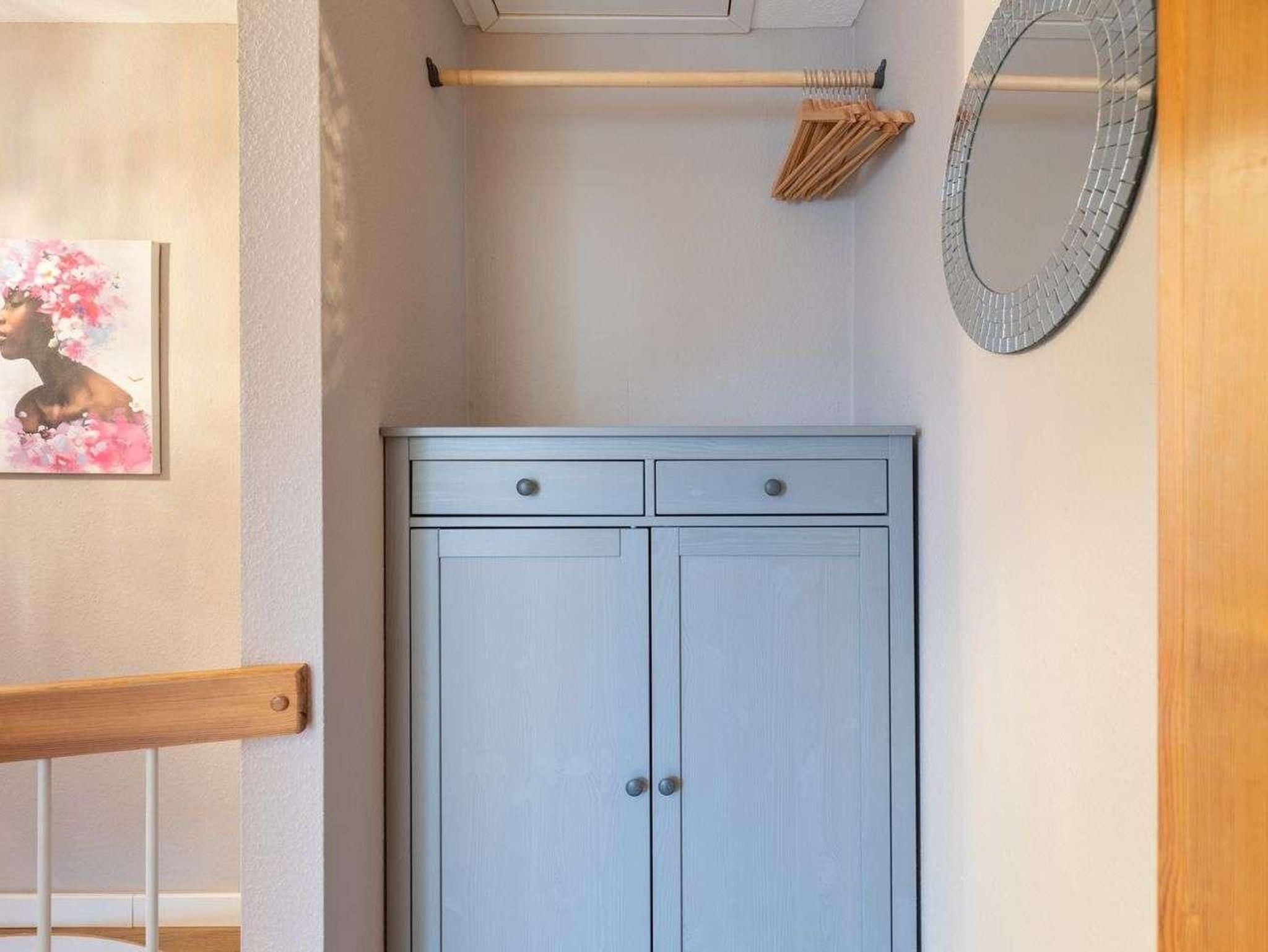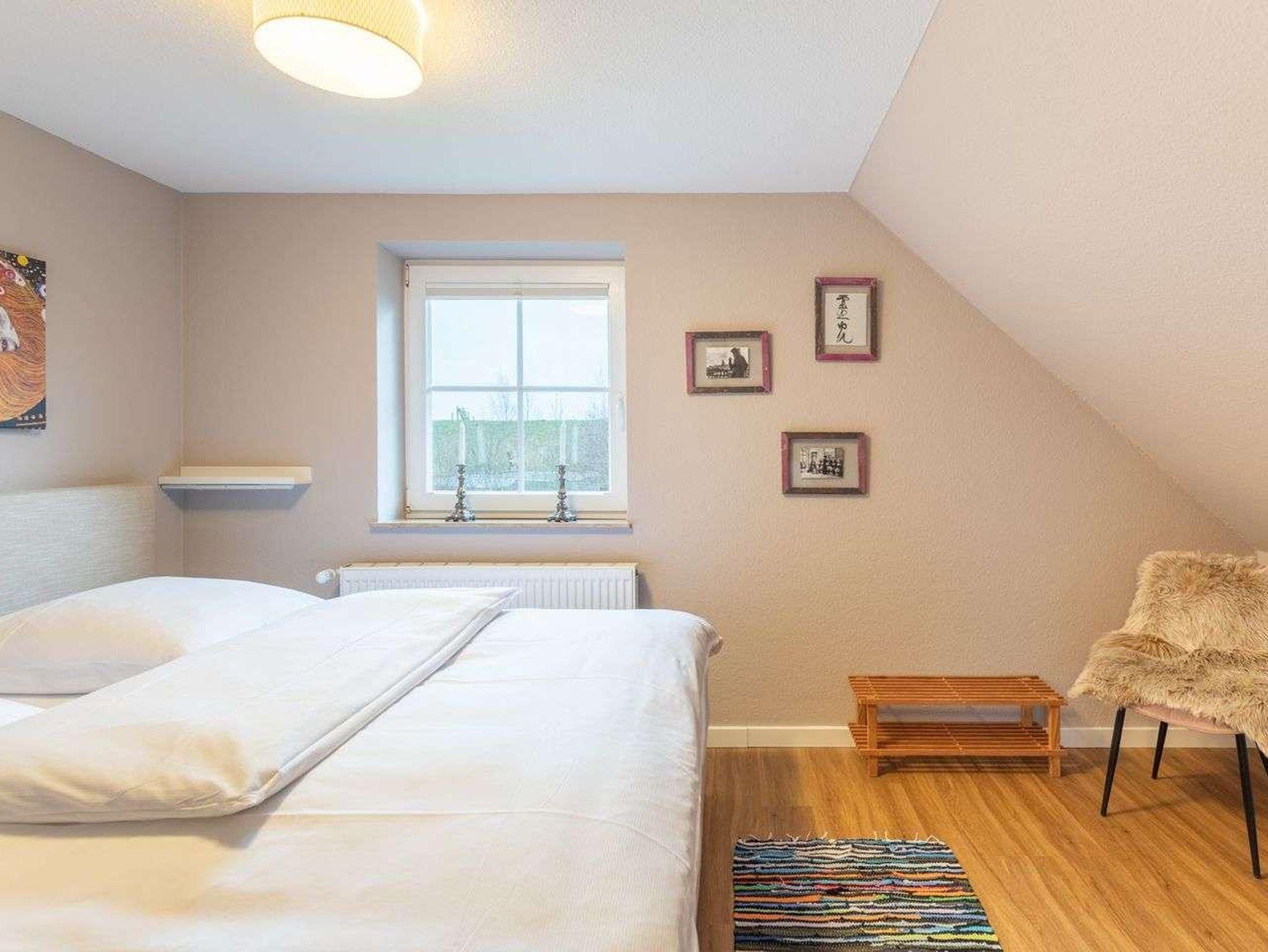 Im Obergeschoss befindet sich ein Schlafzimmer mit einem Kleiderschrank sowie einem King-Size-Boxspringbett (180 x 200), aus welchem Sie direkt auf den Deich schauen können. Das Badezimmer befindet sich auf derselben Etage und ist mit einer modernen Dusche, Toilette, Waschbecken und einem beleuchteten Spiegel ausgestattet. Über eine Treppe gelangen Sie in den offenen Wohnraum. Hier finden Sie eine gut ausgestattete Küche mit Kühlschrank, Backofen, Geschirrspülmaschine, Wasserkocher, Toaster und einer Tchibo - Kaffeemaschine.