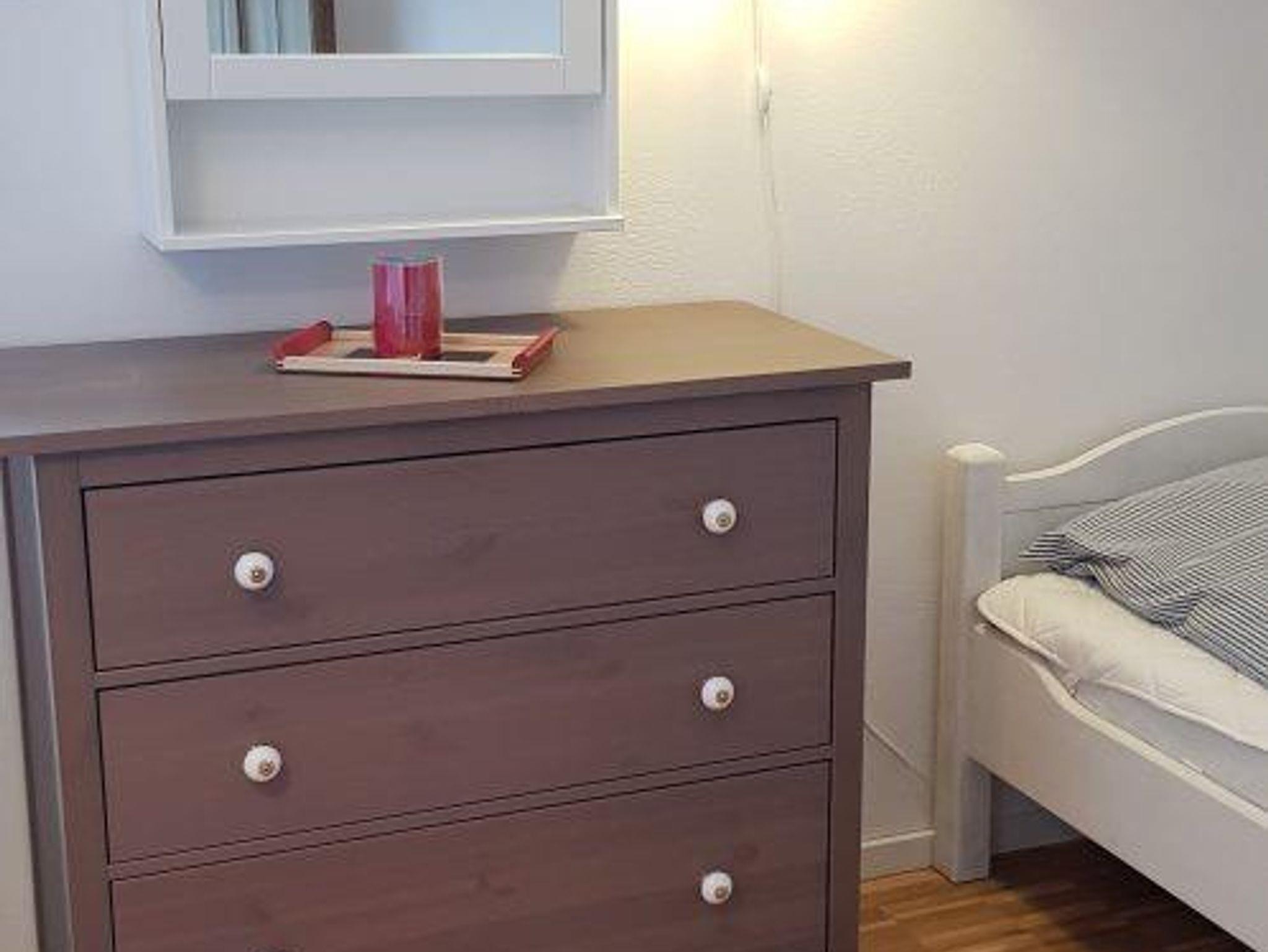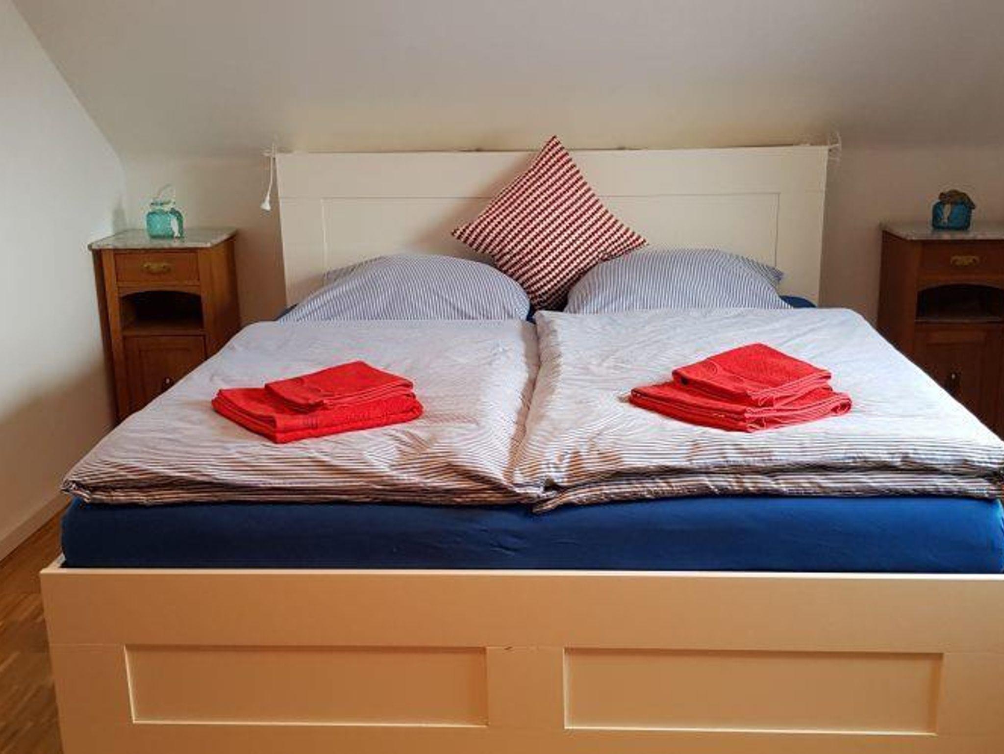 Schlafzimmer mit Doppelbett (180x200 cm, großes Laken notwendig) und einem Einzelbett (90x200 cm), Kleiderschrank und Kommode