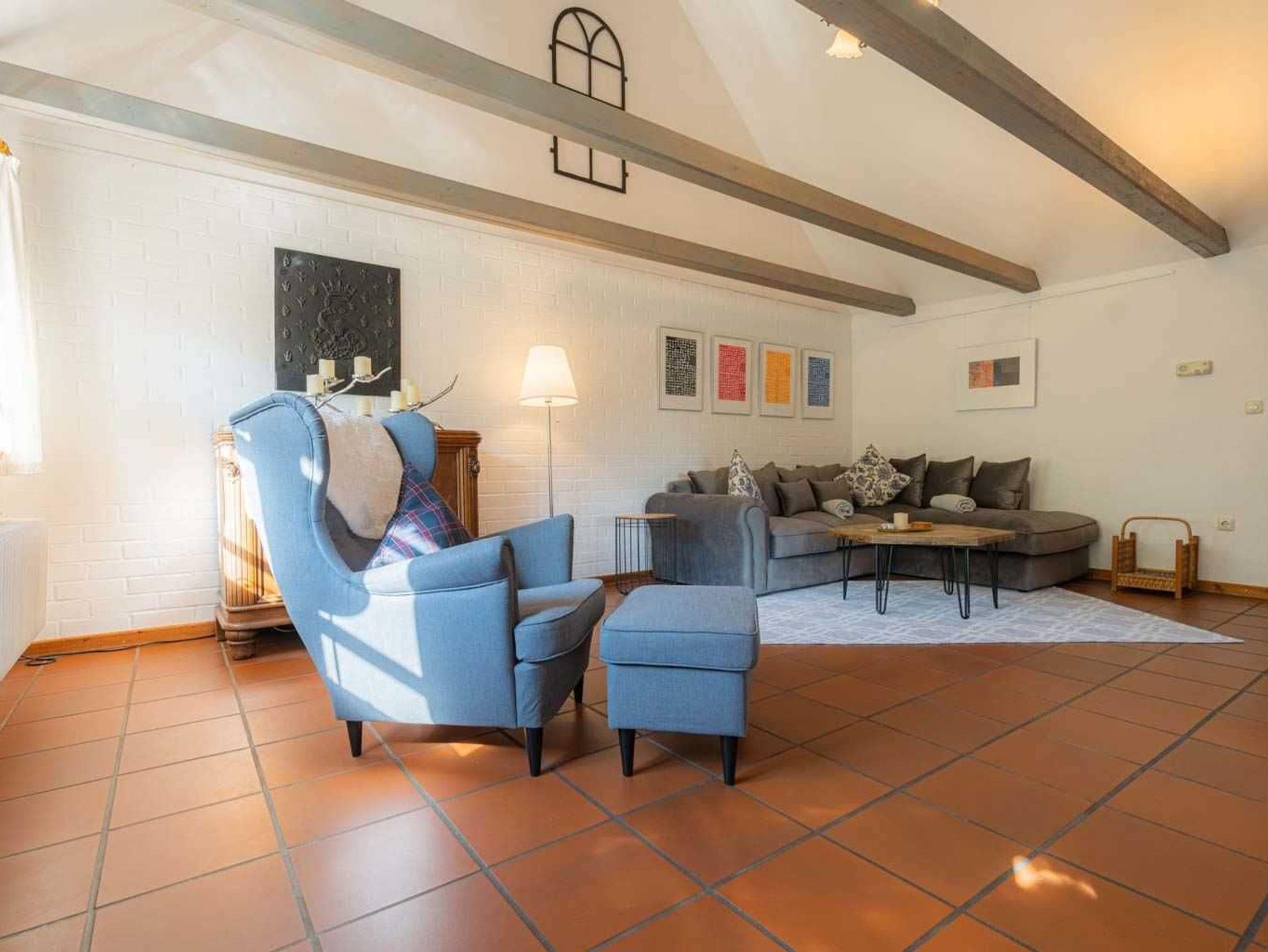 Wohnzimmer mit gemütlicher Wohnlandschaft, bequemem Ohrensessel und SMART-TV (Sat). Die offene Küche bietet mit Backofen, Geschirrspüler, Kühlschrank mit Gefrierfach und Nespresso Kapsel-Kaffeemaschine jeglichen Komfort. Vor der Küche befindet sich der Essbereich mit großem Esstisch.
