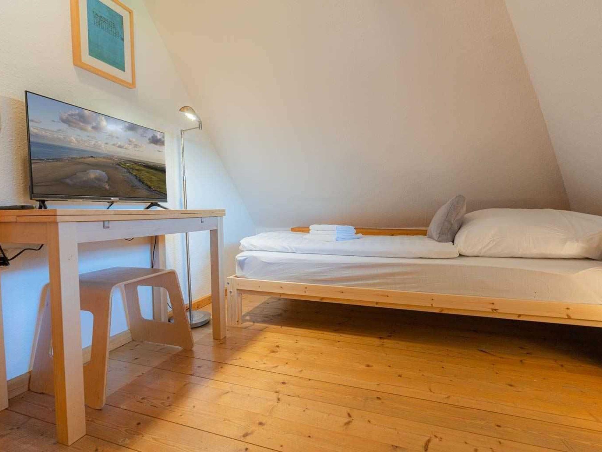 Schlafzimmer mit Doppelbett (2x 90x200cm), SMART-TV (nur Streaming via Fire TV Stick), Kommode und Garderobenstange.