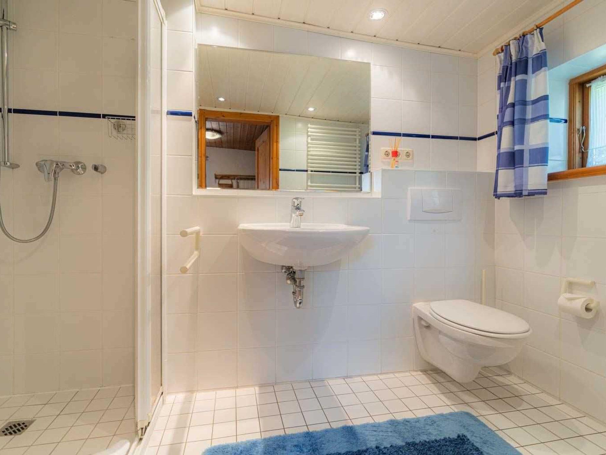 Badezimmer (Duschbad) mit bodengleicher Dusche, WC, Föhn und Tageslicht.