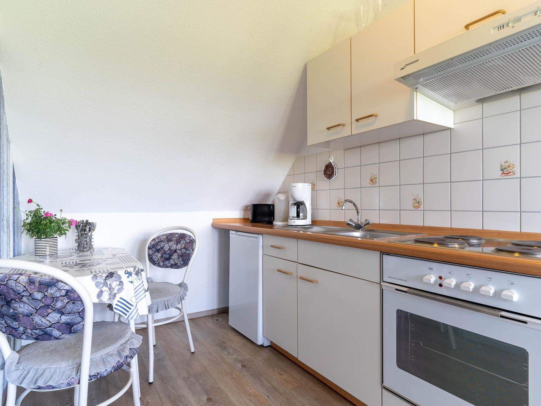 Die Küchenzeile mit separatem Essbereich ist im Wohnraum integriert.